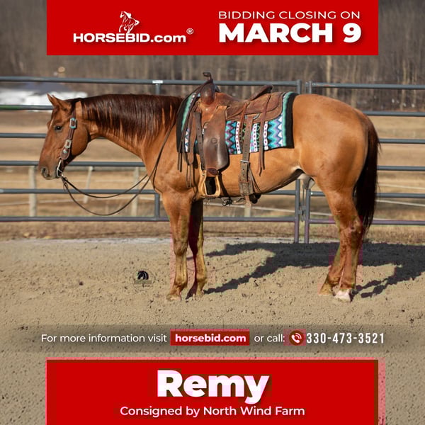 ℳ𝒶𝓇𝒸𝒽 ♦️𝐑𝐈𝐃𝐄𝐑'𝐒 𝐂𝐇𝐎𝐈𝐂𝐄♦️ Happening now thru MONDAY | MARCH 9th - Available EXCLUSIVELY on HorseBid's website! For more details and to register visit: www.Horsebid.com CONSIGNOR CONTACT: North Wind Farm 330-473-3521 LOCATION: Fredericksburg OH BREED: AQHA REGISTERED: Yes REGISTERED NAME: San Buck Tari COLOR: Red Dun HEIGHT: 14.3 AGE: 5 GENDER: Gelding San Buck Tari, “Remy” is a 5 yr old registered AQHA gelding standing at 14.3hh. He is well trained and very fun to ride. Remy has good ground manners, he stands well for grooming, tacking up, and getting bathes. He loves turnout and is good in the pasture with other horses. Remy is a seasoned trail horse. He has been on a lot of trails, he doesn’t mind creeks, steps easily over logs, and is surefooted when going steep hills. He will ride out alone without issues, and also rides quietly in a group! He is used to being around dogs and atvs. Remy will go through the obstacles as well! He can be rode western and bridless! In the arena he is very talented and has the smoothest walk, trot, canter. He knows both of his leads well, he will move off of leg pressure, has a nice stop, back up and pivot! He will side pass, open and shut gates! Remy is very smart and tries his hardest to please his rider!