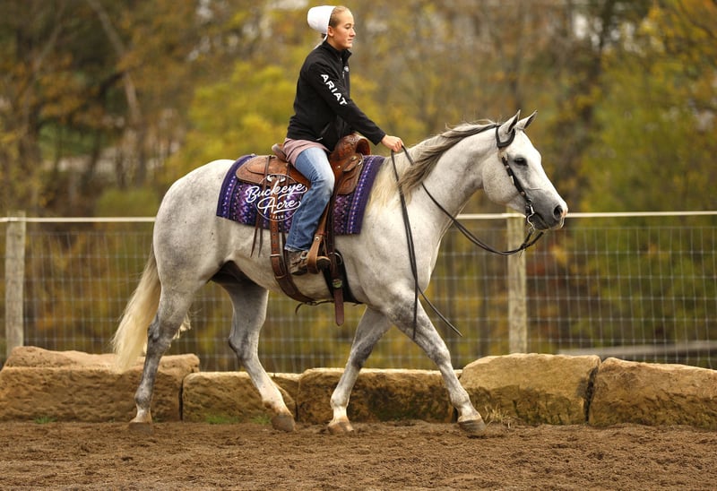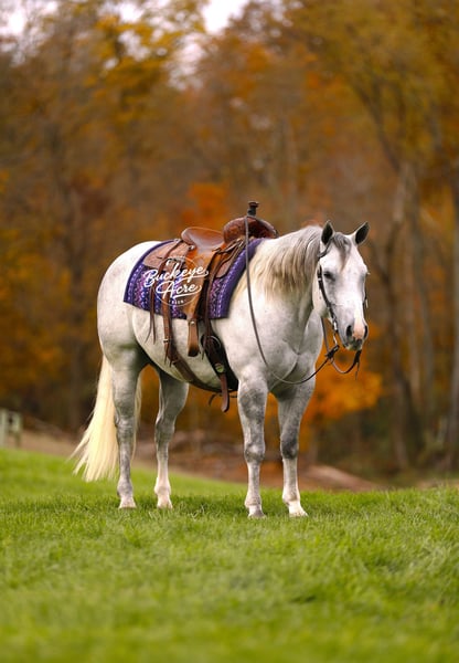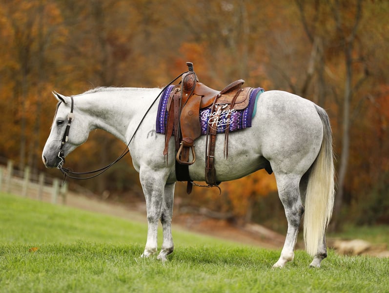 Wow oh wow, Infinity is one of those horses that truly stops you in your tracks. From his beautiful dappled grey coat to his couple of white socks and that cute little snip on his nose, he is the full package. Infinity is a 2021 model AQHA gelding standing a strong 14.3 hands tall, built with the kind of conformation that turns heads anywhere you take him. Whether you are looking for that wow-factor trail partner, something to step into the ranch classes, or simply a horse that makes you proud every time you swing a leg over, he checks all those boxes. Infinity has seen the miles and handles them like a seasoned veteran. He has been down countless trails through thick woods, up and down hills, across logs, through creeks, and out on state roads in traffic without batting an eye. He goes where you point him and never gets bothered about what is around the next corner. He has also been used to check cows and fence lines, making him handy and confident with real-life work. One thing we appreciate is that Infinity does not need to be ridden every day to stay the same. Leave him sit for a few days and he comes out willing, level-headed, and ready to go. He has been ridden Western, English, and bareback, and takes everything in stride. His movement is extremely smooth and comfortable, from the walk to the trot, extended trot, and lope. He has been ridden in the indoor and outdoor arenas, knows his leads, and side-passes right up to the mounting block to make getting on easy. He has seen jugs, tarps, whips, and all kinds of obstacles and handles them all calmly. Infinity is up to date on shoeing, vaccinations, and deworming, making him ready to go for any new home without worry. This is the type of gelding you can enjoy on the trails one day, take to a ranch show the next, or let the kids ride around and have fun. He is safe and suitable for riders of any level, from beginners to seniors to experienced riders wanting something steady and classy. Infinity loves attention and is the kind that greets you at the gate, hoping for scratches and company. He is good for the farrier, stands well in the wash bay, and is simply an enjoyable horse to be around in every way. If this sounds like the horse you have been looking for, feel free to reach out to Duane at 330-231-2324 for more information or to schedule a day to stop by and see him in person.