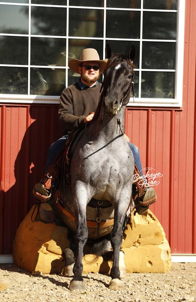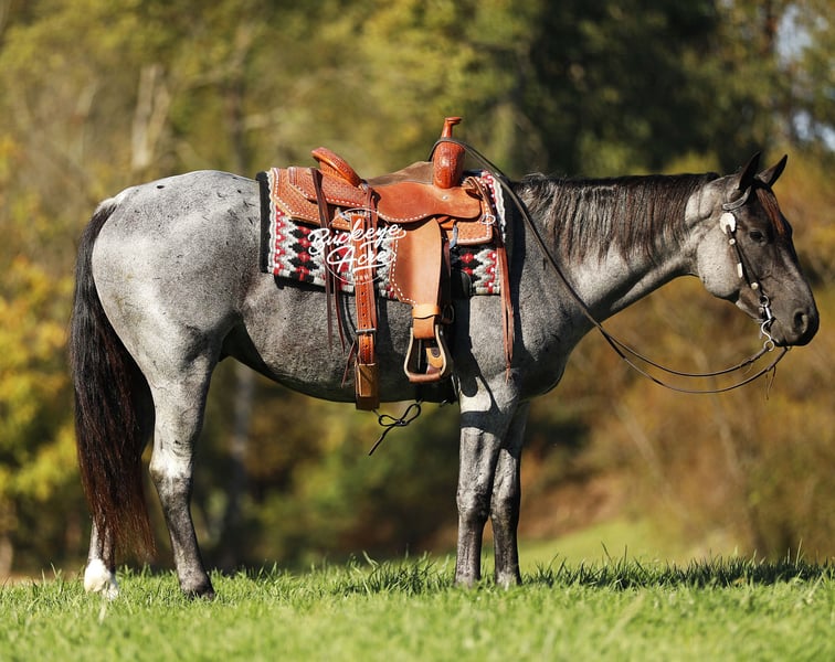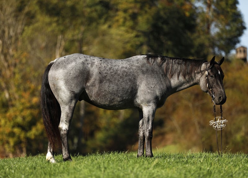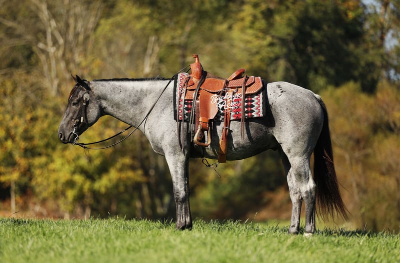 Meet Tokyo, a beautiful, good-minded 2021 model blue roan Grade Quarter Horse gelding standing a strong 15 hands tall with all the right looks and an even better attitude. His blue roan dappled color, one white hind sock, and small white star set perfectly on his forehead make him a true standout everywhere he goes. Pair with a bright, soft eye and a natural want-to-please attitude, and you have a gelding that is as dependable as he is attractive. Tokyo is the kind of horse you can ride out of the barn any day of the week and know exactly what you are getting. He drops his head right where it should be, settles into his work, and stays quiet, soft, and steady from start to finish. He does not require daily riding to stay safe and honest—give him a couple of days off or give him a week, he comes back the same every time. He has been exposed to all kinds of environments and takes everything in stride. Tokyo has seen new places, covered lots of trail miles, and is confident in both indoor and outdoor arenas. He has been down state roads and through traffic without batting an eye. Jugs, tarps, whips, water crossings, logs, uphill, downhill, you can point him anywhere and he goes with confidence and charm. Versatility is another thing he offers in spades. Tokyo rides western, English, and bareback, will side pass, ride bride less, and stay soft in the bridle. He is the kind of horse you can trust for kids, seniors, beginners, or advanced riders. He is solid and forgiving, yet responsive enough for someone who wants to do more. He rides out alone or with a group and keeps a calm, collected way of going that makes every ride feel steady and dependable. He has a good forward walk, a willing trot, and a consistent way of carrying himself that makes him enjoyable for riders of all levels. In the barn or wash bay he is calm, mannerly, and easy to handle. He is also good with loading and unloading from the trailer, making hauling a breeze. Tokyo is up to date on deworming, vaccinations, and shoeing and is ready to fit seamlessly into someone’s program, family, or riding routine. If this sounds like the horse that you have been looking for, please feel free to reach out to Duane @ 330-231-2324 for more info or to Schedule a day to stop by our farm.