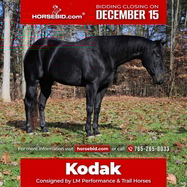 🎄𝐓𝐇𝐄 𝑯𝒐𝒍𝒊𝒅𝒂𝒚 𝐂𝐋𝐀𝐒𝐒𝐈𝐂🎄 Happening now thru MONDAY | DECEMBER 15th - Available EXCLUSIVELY on HorseBid's website! For more details and to register visit: www.Horsebid.com CONSIGNOR CONTACT: LM Performance & Trail Horses 765-265-0033 LOCATION: Batesville IN BREED: Quarter Horse REGISTERED: Yes REGISTERED NAME: Hancocks Jagger COLOR: Black HEIGHT: 15.1 AGE: 4 GENDER: Gelding “Hancocks Jagger” aka Kodak, is a very attractive 2021 model. He is a registered AQHA gelding that stands a stout 15.1 hh tall. Kodak is a barn favorite with his calm and loving demeanor. His best quality is his willingness to do anything you ask of him and keeping you safe while doing so. Kodak will be your right hand man for your journey to starting young colts. Since owning Kodak he has been used on the ranch to gather and sort cattle. Kodak has also put his skills to catching loose cattle off the ranch. He is very willing to pick you up off the fence or mounting block to go take a relaxing trail ride. Kodak maneuvers through rough terrain with ease. He has a smooth jog, along with picking up his leads, loping circles both ways, and a nice slow collected spin. He rides with his head low on a loose/draped rein and has a nice stop. Kodak is looking for his life time partner whether that is walking slow and easy down the trail, showing in the ranch horse classes and or making him an asset to your everyday ranch life. He is the type of horse the whole family will enjoy! Please call Logan at 765-265-0033 with any questions. Nation wide shipping can be arranged.