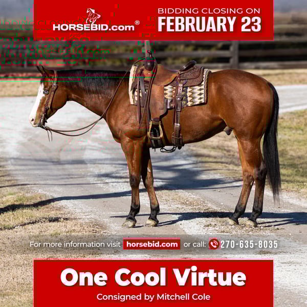 💎 𝐓𝐇𝐄 𝓓𝓲𝓪𝓶𝓸𝓷𝓭 𝐒𝐇𝐎𝐖𝐂𝐀𝐒𝐄 💎 Happening now thru MONDAY | FEBRUARY 23rd - Available EXCLUSIVELY on HorseBid's website! For more details and to register visit: www.Horsebid.com CONSIGNOR CONTACT: Mitchell Cole 270-635-8035 LOCATION: Madisonville, KY BREED: AQHA REGISTERED: Yes REGISTERED NAME: One Cool Virtue COLOR: Bay HEIGHT: 15.2 AGE: 5 GENDER: Gelding Poncho is a 2021 beautiful bay gelding standing 15.2! He is double registered in the AQHA, as well as the APHA! When combining his conformation, his big bald face, as well as his kindness and willingness to try, it sure makes him the kind that is hard to find! Poncho has been ridden countless miles outside already, and is sure to make you a go to trail horse for many more years! He crosses bridges, water, and takes all of the obstacles like a champ! Poncho would also make a great weekend show horse at the fun shows, and the 4H events! He is a dream in the arena! He will walk, trot, and lope with a nice level headset, and catching both of his leads without a problem! He is easy to catch in the pasture, and gets along great with others! Poncho stands well for the farrier, stands to be mounted, and loads and unloads with ease! He does well with time off, and is an extremely easy keeper! If you’re looking for a honest, pretty, and gentle gelding to enjoy on the weekends, or to be competitive on, Poncho is your man. He sells 100% sound! For any questions or concerns, do not hesitate to reach out at (270) 635-8035