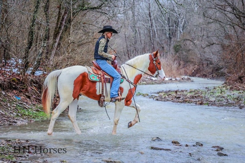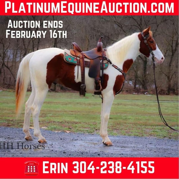 ONLINE AUCTION Place your bids at www.PlatinumEquineAuction.com Starting Bid $3500 Auction ends February 16th, 2025 Need a new saddle? Check out White Rock Saddles on our website or Facebook! This is “MACARONI”, a big 16 hand SORREL & WHITE TOBIANO PAINT GELDING that is 4 years old. This nice young gelding has been on the trails and ridden in the arena English and Western. He has been out in the woods, through the water, and up and down the rocky embankments. He is a smart, big, young horse with lots of natural ability and sense. He would excel in any performance discipline and he is well on his way to be a great trail mount. He goes out alone, been on the main roads, and has a nice way of traveling. He aims to please and will ride in the snow, ice, and mud without an issue. He bathes, hauls, stands tied, and loads with no fuss. Located in Flemingsburg, KY. Contact HH Horses Erin 304-238-4155. ONLINE AUCTION Place your bids at www.PlatinumEquineAuction.com Starting Bid $3500 Auction ends February 16th, 2025 Need a new saddle? Check out White Rock Saddles on our website or Facebook!