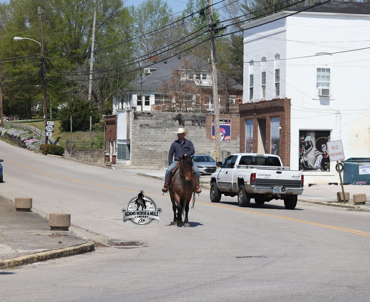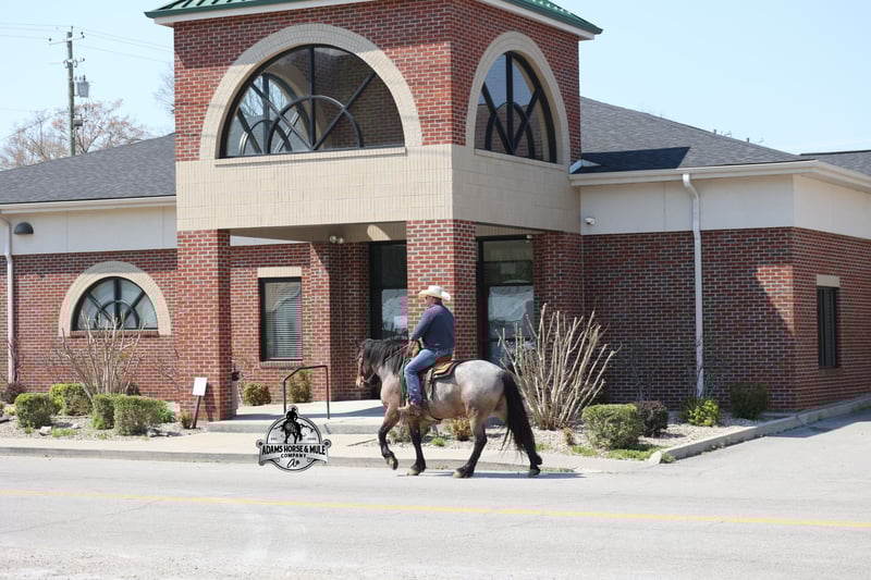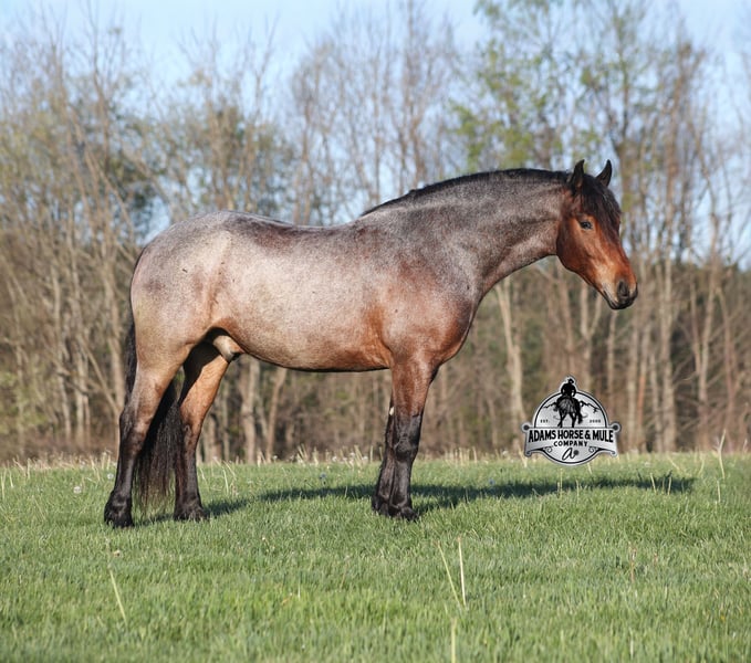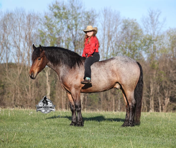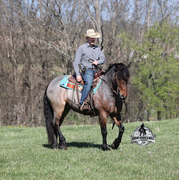 Go to visit our website for more pics and video link at www.AdamsHorseAndMuleCo.com AHAMC has been in the horse business and sold horses over the internet since 2005. We have a long track record of success with hundreds of happy customers. We work hard to match riders with the correct horses and specialize in beginner safe, family friendly horses that have been used and checked out by our family! We can set up transportation anywhere in the US and look forward to working with you. Clover is just as sweet as his name suggest! He is an awesome looking 15.2h, Bay Roan Draftcross gelding! He is 5 years old and is a sturdy built horse. Clover came from the same breeding farm that a lot of our draftcrosses come from and with that farm we find the constant quiet, gentle, laid back temperament that makes them such good family safe trail horses! Clover is no exception to that statement as he is a super quiet, gentle, laid back type of horse that is going to suit any rider and help build your confidence. Not to mention he is very friendly as well! Clover can do a variety of things from pulling carriages, to ranch work or trail rides. Clover has been on camping trips, been ridden in several states and has been ridden by all ages of beginners. We took him on a week long trip to Texas and Missouri back in March as an extra for some of our friends (total beginners!!!) to ride around an exotic ranch. Clover saw Bison, Water Buffalo, Emu, Ostriches, Camels, Nilgai, Blesbok, Ibex, Rusa, Corsican, Zebra, and even got chased by a herd of Wildebeest(they are mean little critters!) We even rode on the beach of the Barzos River and across it as well. But nothing phased Clover! When out on the ranch or going down the trails, he will cross creeks, ditches, logs and navigate rough rocky areas. He is safe in traffic safe whether that be trucks or cars. He’s been ridden around the ranch, checked cows and rode fences. Clover moves very smoothly, as he has a nice jog, his lope is smooth as well and he lopes nice circles on a loose rein! He has been ridden English and goes over the jumps with ease. If you want a sweet guy who will be your best friend, Clover will fit the bill! Feel free to call Eric 606-308-2461 with any questions!