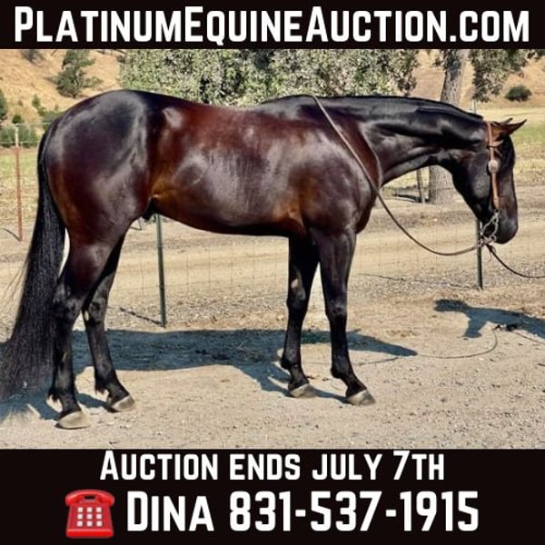 ONLINE AUCTION Place your bids at www.PlatinumEquineAuction.com Starting Bid $3500 Auction ends July 7th, 2024 Need a new saddle? Check out White Rock Saddles on our website or Facebook! Rc Poco Royal King Your dream horse awaits! Zoro AQHA 2021 is a show stopper black gelding currently standing 14.3. He is sired by the great Kelly’s Blue King AQHA – NFQHA blue roan 90 percent foundation bred stallion who goes back to the great Poco Bueno known for their great minds and athletic ability and are extremely versatile and he has clearly passed it down to Zoro. I have to say at my age there are not many young horses I trust and I trust this horse whole heartedly. He is gentle and has no spook to him at all he’s amazingly calm and easy going. He has been started correct with natural horsemanship method. He rides with a nice low headset and uses his body correctly. He lopes beautiful circles and is crossing over nicely in his turn around. He responds to leg cues and will arch and counter arch with the slightest touch. This boy is extremely gentle for his age and takes everything asked of him in stride. He has been used to gather cattle all winter and even branded a few calves and has done everything he’s been asked. He is sure footed and easy to handle will go out alone or with others and doesn’t mind riding off and leaving the herd. He is cowey and confident crosses water, logs and has seen tons of wildlife. We have desensitized him to the ball, tarp and flag and he will not bat an eye at any of it. Zoro has been around some trail obstacles and does great with new things. He has been to town and isn’t bothered by cars or loud noises. He is very willing and adaptable with the most amazing mind and temperament. He ties,clips and bathes is great for the farrier and vet. This boy has an amazing future and could go in any direction great trail partner, extreme ranch obstacle, ranch, rope, or performance horse the possibilities are absolute endless. He has handled time off great and acts like he never missed a day off he has no bad habits and is super easy to be around, handle and ride he is extremely gentle acts like a horse well beyond his years. This boy Will absolutely make everyone notice him with his beauty and style. He will be the Apple of you’re eye and barn favorite. If you would like to come take Zoro for a spin or have any question contact Longhorn Ranch call Dina 831-537-1915 Located in Paicines, CA. ONLINE AUCTION Place your bids at www.PlatinumEquineAuction.com Starting Bid $3500 Auction ends July 7th, 2024 Need a new saddle? Check out White Rock Saddles on our website or Facebook!