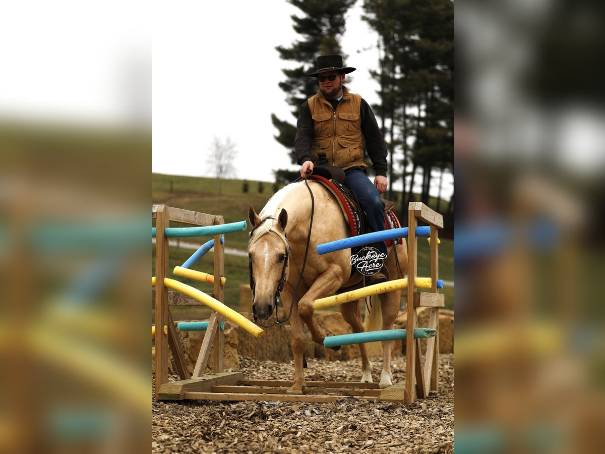 Meet Platinum, a golden palomino gelding with a heart as big as his presence. This 2021 model, 14.2-hand AQHA gelding comes from an exceptional lineage, including Wimpys Little Step, Nu Chex To Cash, and Smart Little Lena. With his flowing mane and tail, bright eye, two white hind socks, and a small white strip on his forehead, Platinum is a horse who naturally draws attention and admiration wherever he goes. Platinum is not just a beautiful horse – he’s a partner you can rely on. He has explored miles of trails, crossed state roads with traffic, and helped check cows and fence lines in the back pastures. He confidently navigates uphill, downhill, over logs, and through challenging terrain, all with his rare, willing-to-please attitude. Every ride with Platinum is smooth and enjoyable, whether at a walk, trot, extended trot, or canter. He knows his leads, performs lead changes, and can side pass right up to the mounting block, making him versatile for every type of ride. He has been ridden western, English, and bareback, in both indoor and outdoor arenas, and is safe and dependable for riders of any skill level – beginner, senior, or advanced. Platinum does not require daily riding to stay consistent; he’s just as ready for a quiet trail ride one day as he is for a show the next. He rides well alone or in a group and enjoys the company of other horses. He loves greeting you at the gate, getting some scratches, and offering his gentle companionship. Platinum needs no maintenance at all. He is up to date on vaccinations, deworming, and shoeing, and thrives without any extra care, making him perfect for someone looking for a versatile, dependable partner. If you are looking for a dependable, kind-hearted, and adaptable horse who can be a family partner, trail companion, or performance mount, Platinum may be the perfect fit. For more information or to schedule a visit to meet him in person, please reach out to Duane at 330-231-2324. Come see this golden gelding in action – he is ready to be your next equine friend.