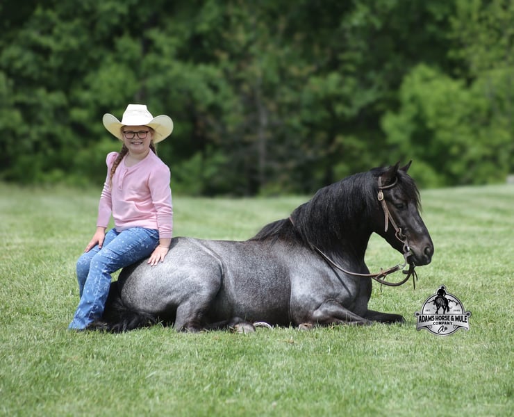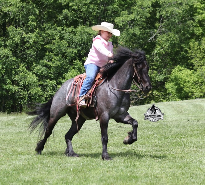 Razz is consigned to the Best Of The West Horse Sale in Gladstone, NJ on September 26-27th. You can bid online or bid in person. There is a preview day before the sale or you can come ride him prior to the sale in Mt. Vernon, KY. Razz is a 13.2h, 4 year old, Gypsy Vanner Cross, True Blue Roan Gelding and if you are looking for a horse that will bring countless smiles, miles of memories and nothing but good times in the saddle… then meet Razz. Razz has been our 7-year-old boys favorite ride all summer long, and he has been tested over and over again, passing with flying colors every time! This guy loves attention and likes to be pampered! From braids to baths, he loves his time with his kids! He is gentle enough for the kids to ride but stout enough to comfortably carry a smaller adult. Razz is a phenomenal trail horse and goes anywhere that he is asked. He has been ridden up/down steep slopes, across creeks, ditches, deadfall, rough rocky areas… you name it, and he can handle it. He rides with confidence, will go out alone, will ride in the front or back of the group and leaves the barn with no issues. Razz is traffic safe and has been ridden through town. He lopes nice circles, takes the correct leads, has a good stop and is easy to operate. In addition to riding western Razz has been ridden English and has been over jumps. He has been ridden around the ranch and through the cows. Razz is a great horse for the whole family to love and enjoy for years to come! For more info call 606-308-2461.