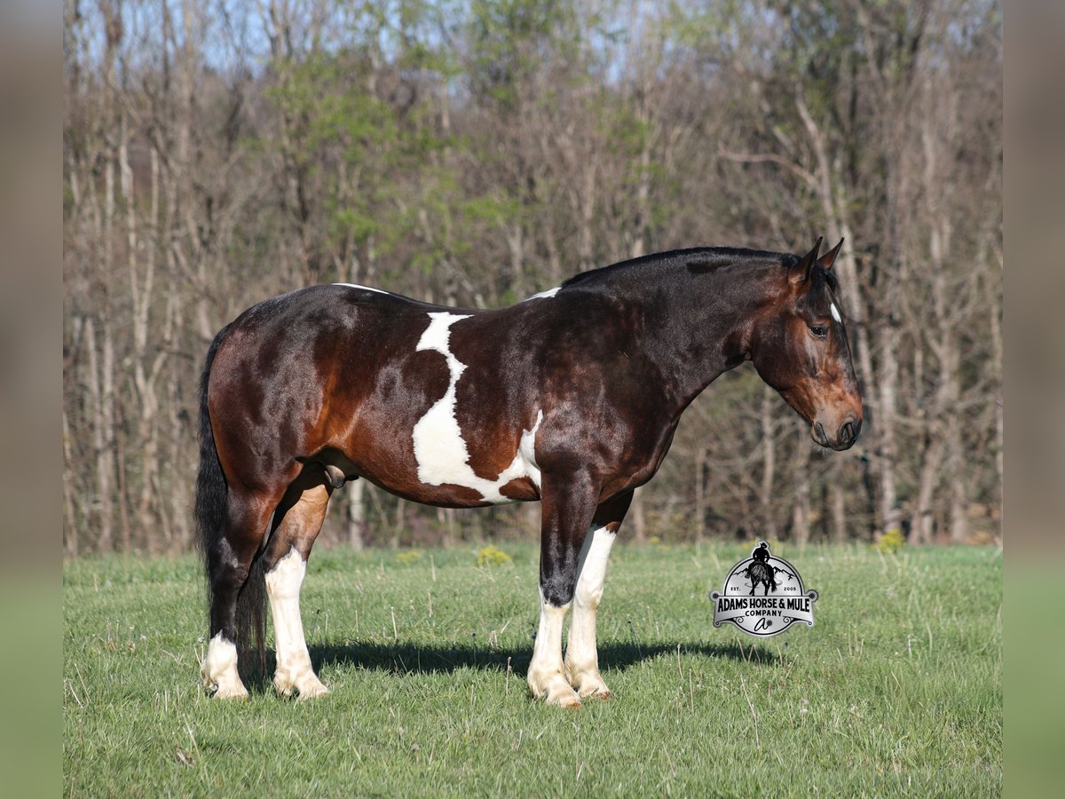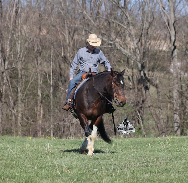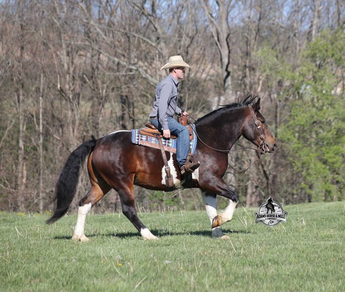 Go to visit our website for more pics and video link at www.AdamsHorseAndMuleCo.com AHAMC has been in the horse business and sold horses over the internet since 2005. We have a long track record of success with hundreds of happy customers. We work hard to match riders with the correct horses and specialize in beginner safe, family friendly horses that have been used and checked out by our family! We can set up transportation anywhere in the US and look forward to working with you. Cherokee looks like something straight out of a fairy tale with his muscular build, beautiful color pattern and he is even better in person! This Draftcross gelding is a beautiful bay tobiano, that is weighing in around 1450lbs and stands around 15.3H! He is 5 years old and is very well built. Cherokee has been through out natural horsemanship program, knows how to lay down on command, has the friendliest personality, loves attention and is everyone’s best friend. He has done it all… From riding around town and through the bank drive-thru, Cherokee will go anywhere that he is asked. He has been ridden around the ranch, checked cows and rode fences. He is a slow and laid back type of horse that will just ease along down the trails with no hesitation. Cherokee is a horse that the whole family will love and one that will help build everyone’s confidence levels! He has been camping in several states and has been ridden by all ages of beginners and kids as well. When out on the ranch or going down the trails he will cross creeks, ditches, logs and navigate rough rocky areas. He has been exposed to all kinds of wildlife such as deer or turkey. He has been worked under harness to all types of farm equipment and is traffic safe whether that be trucks or cars. Cherokee has a nice jog, his lope is slow, collected and very easy to set as he lopes nice circles! He has been ridden English and goes over the jumps with ease. Cherokee is the total package and he will take care of you! Feel free to call Eric 606-308-2461 with any questions!