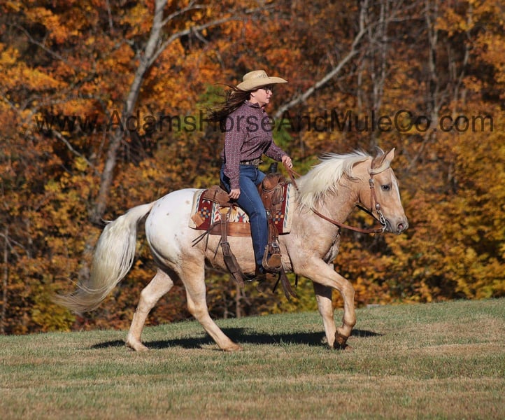 Go to visit our website for more pics and a video. AHAMC has been in the horse business and sold horses over the internet since 2005. We have a long track record of success with hundreds of happy customers. We work hard to match riders with the correct horses and specialize in beginner safe, family friendly horses that have been used and checked out by our family! Trash those X-Boxes, Playstations or other video game consoles, kids don’t need to be glued to a TV… Kids need a horse like Pecos Bill!!! Take a look at the coolest little appaloosa horse that you will see! He has it all going for him from that beautiful palomino color, to that pretty LONG mane and tail and don’t forget about that sweet little lope! Pecos Bill is a 5 year old gelding that is standing around 13.3hh. All fall and winter long Pecos Bill has been one of our 6 year old daughters horse and she has trail ridden him, took him camping, had around the ranch and pushed cows with him. Pecos Bill has been the perfect horse for her! Pecos Bill is plenty stout enough to carry an adult as Mom has taken Pecos Bill out on the ranch, where she has pasture roped and doctored sick ones, herded cattle and the kids have ridden down the trails almost daily! Pecos Bill will cross creeks, ditches, logs and navigate rough rocky areas. He has a nice walk, smooth jog, a good slow lope, he reins around and backs as well! He has been exposed to all kinds of wildlife and will go anywhere that he is asked too. He has been ridden many miles in the mountains of Eastern Kentucky and encountered every obstacle possible on the trail. He will go up or down even the steepest slopes, across deep creeks, over downed trees, and over all types of rough terrain while still being sure footed. Pecos Bill will be a family favorite for years to come! Call 606-308-2461 for more info.