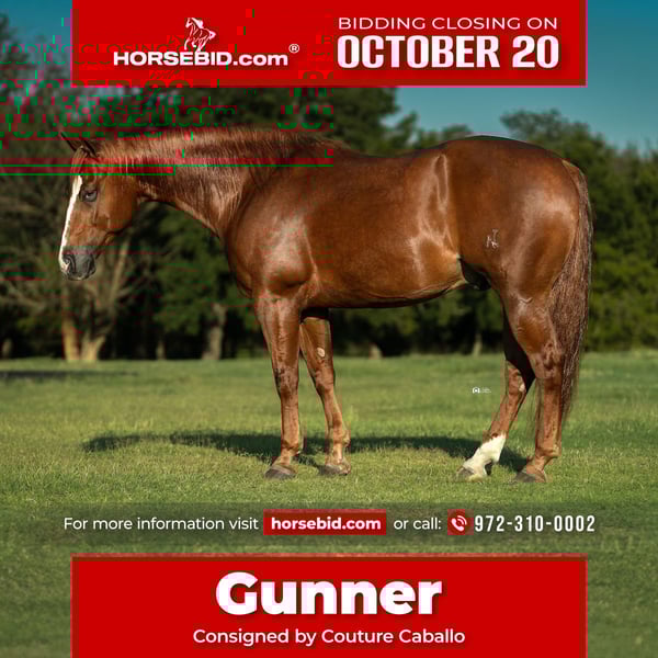 ♦️ 𝐭𝐡𝐞 𝐀𝐌𝐄𝐑𝐈𝐂𝐀𝐍 𝓕𝓪𝓵𝓵 𝓒𝓵𝓪𝓼𝓼𝓲𝓬 ♦️ Happening now thru MONDAY | OCTOBER 20th - Available EXCLUSIVELY on HorseBid's website! For more details and to register visit: www.Horsebid.com CONSIGNOR CONTACT: Couture Caballo 972-310-0002 LOCATION: Gainesville, TX BREED: AQHA REGISTERED: Yes REGISTERED NAME: VB Spook Gunner COLOR: Sorrel HEIGHT: 14.3 AGE: 5 GENDER: Gelding There’s quiet — and then there’s Gunner quiet. By the $7 Million Dollar Sire, Smart Spook, and out of a money-earning daughter of Colonels Smoking Gun ($14 Million Dollar Sire) — “Gunner” is the definition of what makes this cross so timeless. Predictable, consistent, and comfortable, he’s that classic Smart Spook gelding through and through. The kind that’s easy to be around, effortless to ride, and impossible not to love. Trained, useful, and genuinely kind, “Gunner” saddles up gentle every single time- whether he’s been off for a month or worked daily. He’s solid in all reining maneuvers, easy to change leads, and doesn’t require a “user manual” to operate. As an individual, he’s as morally sound as they come — never leaks to the barn, never buddy sour. Simple, soft, and responsive without ever being reactive, he doesn’t need a big bit or a long warm up to go do his job. One look in his eye tells you everything you need to know — he’s as trustworthy and pure hearted as they come. The kind that builds confidence, earns trust, and brings out the best in every rider. He knows the difference. “Gunner” is an experienced lesson horse, the one that makes you want to go ride. In September, he babysat kids at a busy ranch horse show, then earlier this month, Bar MB Ranch swung aboard to win the Novice Trail with a 73, place 2nd in Ranch Rail, Ranch Pleasure, and Reining, and finish just a few points shy of the Novice Horse High Point against a dense field of competition. When the showing wrapped, he quietly transitioned right back to babysitter duty — safely packing kids around all afternoon without missing a beat. Started in the box, used to drag calves to the fire, and confidently beginning in the breakaway, he carries the mind and composure of a seasoned eleven year old. Quiet. Sound. Solid. A true family horse — effortless, reliable, and all heart. No maintenance. No vices. UTD on all care. Selling with a fresh set of X-rays and vet statement. Offered exclusively by Couture Caballo, he’s the quiet confidence every rider deserves.. trained, trusted, and ready to go wherever you point him!