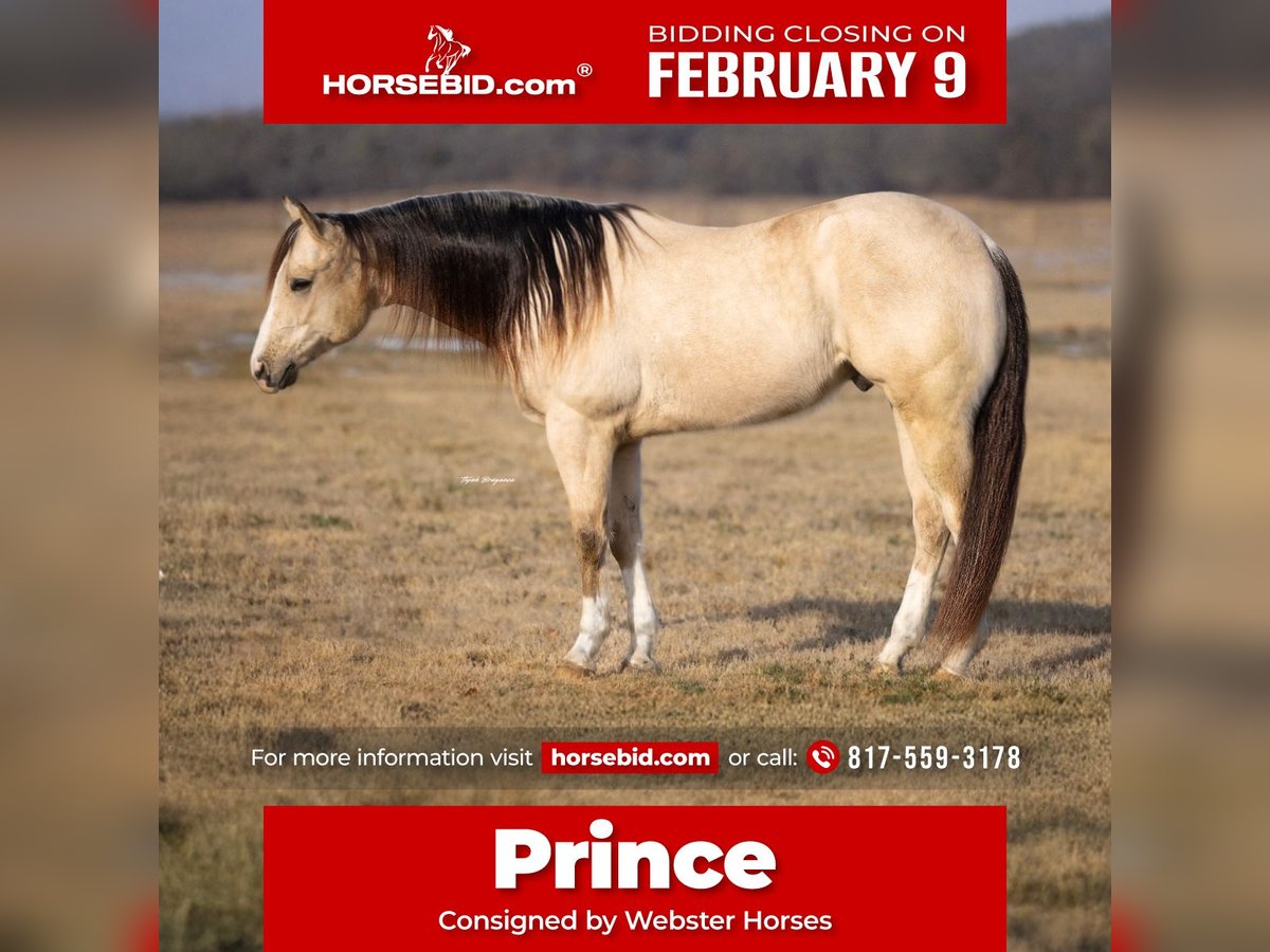 ❤️🔥𝑩𝒆 𝑴𝒊𝒏𝒆 𝐒𝐄𝐋𝐄𝐂𝐓❤️🔥 Happening now thru MONDAY | FEBRUARY 9th - Available EXCLUSIVELY on HorseBid's website! For more details and to register visit: www.Horsebid.com CONSIGNOR CONTACT: Webster Horses 817-559-3178 LOCATION: Ponder TX BREED: AQHA REGISTERED: Yes REGISTERED NAME: UCAN CALL ME MISTER COLOR: Buckskin HEIGHT: 15 AGE: 6 GENDER: Gelding Prince is a coming 6yo 15hh registered AQHA gelding! You will not find a horse this age as civil as he is. He’s been hauled and seasoned on trails and has been in multiple parades. He has the experience most old horses have at his age. He has years to last as well. He has a correct nice handle on him. Anyone can ride him. Collects and breaks at the poll beautifully at all gates. He has a nice turn around. W/T/C with ease. He will also short lope off. Picks up both his leads great. He is not fast or performance minded. Definitely more woah than go, but not lazy where you have to constantly kick to go. He has a very comfortable and smooth gate. Where he is not performance minded, the best avenue for him if you wanted to do any kind of event would be ranch/trail or obstacle courses. He is so so civil. Leave him off for a while and get right on. He is honest. He has such a unique look with all 4 high white socks, and his big blaze face, striking dark points on his legs and ears. You could absolutely show him in a halter class as well. He would also be great for anyone just wanting to go down the trail or have a gentle family horse. He will go over/through anything. Just recently ridden through the Vaquero gathering in the down town Fort Worth Stockyards! He’s healthy, and is super easy to catch and shoe. Stands calm, no pawing or nickering. He’s perfectly fine to be the only horse you have because he is NOT sour at all. However if you have other horses, he’s good with others too. He loads and unloads easily. Sound mover, PPEs are welcome at buyers expense. Please contact Olivia with any questions 817-559-3178. Shipping can be arranged anywhere.