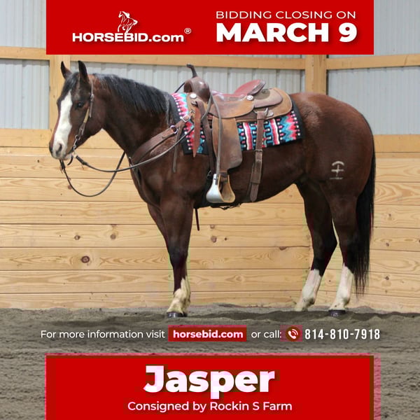 ℳ𝒶𝓇𝒸𝒽 ♦️𝐑𝐈𝐃𝐄𝐑'𝐒 𝐂𝐇𝐎𝐈𝐂𝐄♦️ Happening now thru MONDAY | MARCH 9th - Available EXCLUSIVELY on HorseBid's website! For more details and to register visit: www.Horsebid.com CONSIGNOR CONTACT: Rockin S Farm 814-810-7918 LOCATION: Rebersburg, PA BREED: Quarter horse REGISTERED: Yes REGISTERED NAME: Skip O Jasper COLOR: Bay HEIGHT: 15 AGE: 6 GENDER: Gelding 💥💥 Jasper 💥💥 Wow! Here's a scroll stopper! Jasper is a striking bay gelding with the kind of versatility, disposition, and eye appeal that make him a true standout. Quiet, kind, and exceptionally well-mannered, he is the type of horse that fits seamlessly into any program. Jasper has proven himself to be safe, sane and simple to ride in every situation. Fancy when it counts and gentle enough for the whole family. He handles cattle confidently, stays level-headed, and carries himself with the steadiness you want in a reliable partner. On the trail, Jasper is sure-footed and relaxed, traveling out willingly and taking new scenery in stride. He will ride out alone or in a group and is not barn or buddy sour In the arena, Jasper will ride smoothly in a walk trot canter and get his leads, He is responsive, soft in the bridle, and rides around with balance and style. Jasper will ride English or western and he remains forgiving and suitable for riders of varying experience levels. He moves beautifully, carrying himself with balance and fluidity through his gaits. One of his greatest qualities is his exceptional ground manners — he is respectful, easy to handle, and a pleasure to be around in every setting. Beyond his talent and training, Jasper is incredibly sweet and personable. He genuinely enjoys attention and is easy to get along with, making him a favorite in the barn. He does not require daily riding to stay broke, maintaining his quiet, steady nature even with time off. With his eye-catching color, kind personality, and well-rounded résumé, Jasper is the kind of gelding that will make someone proud whether on the ranch, in the arena, or out on the trail. He sells 100%sound and healthy and requires no maintenance, he stands well for the vet and farrier and is up-to-date on farrier and dental as well as a current Coggins and health certificate It is an honor to offer this super nice guy and if you have any questions please feel free to call Sam 814-810-7918 We are happy to assist in arranging transportation anywhere in the US