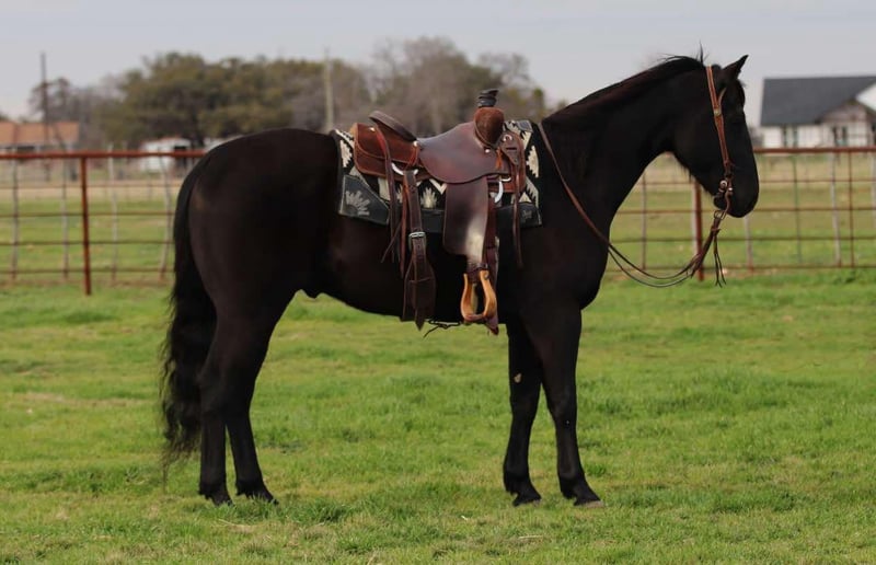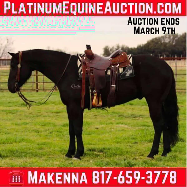 ONLINE AUCTION Place your bids at www.PlatinumEquineAuction.com Starting Bid $3500 Auction ends March 9th, 2025 Need a new saddle? Check out White Rock Saddles on our website or Facebook! Say hello to this stunning gelding name Bentley that we call Benz ! He will sure enough get all the attention around being 15 hands tall and jet black. He’s a 5 yr old gelding off the coats ranch. Benz is the first one to the gate to greet you and loves attention. He’s gentle to shoe, haul and loves a good bath in the summer. He’s been used in every aspect of ranching making him ideal for your next ranch; or trail gelding! Not to mention he doesn’t get bothered by traffic or commotion around him. He is very willing going down the trail and goes where ever he’s pointed over big hills, creeks or rock patches. Located in Lipan, TX. We can help arrange shipping anywhere in the US, Hawaii, Canada Please call or text Makenna Hartzell 817-659-3778 for more information. ONLINE AUCTION Place your bids at www.PlatinumEquineAuction.com Starting Bid $3500 Auction ends March 9th, 2025 Need a new saddle? Check out White Rock Saddles on our website or Facebook!