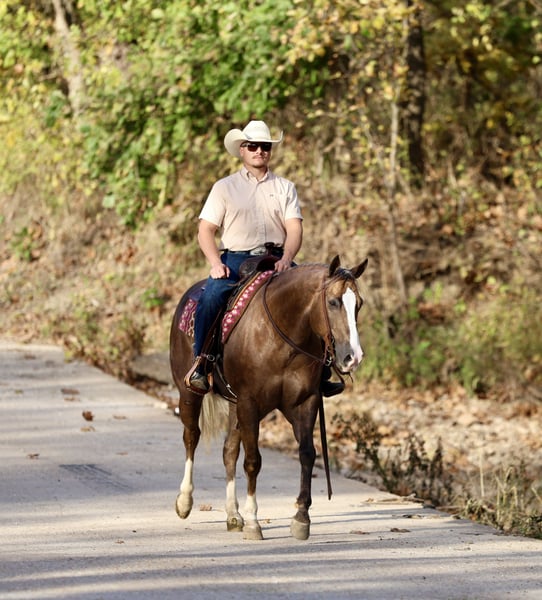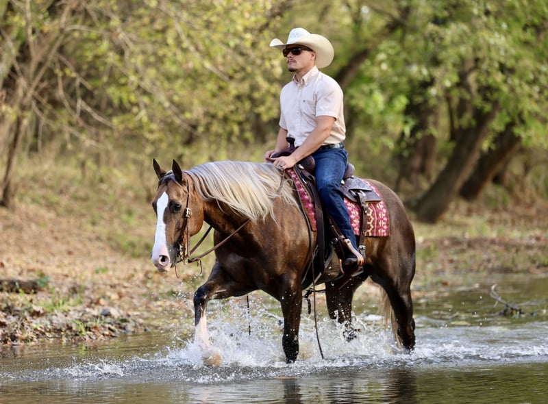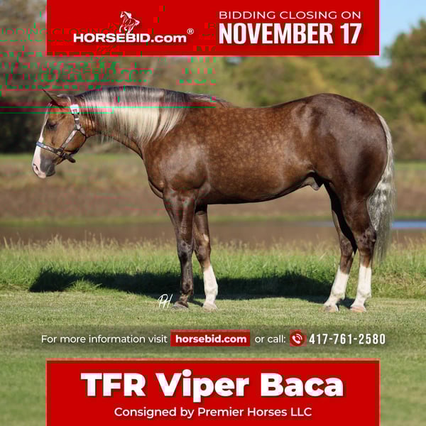 🎲𝓽𝓱𝓮 𝐑𝐈𝐃𝐄𝐑'𝐒 𝓒𝓱𝓸𝓲𝓬𝓮🎲 Happening now thru MONDAY | NOVEMBER 17th - Available EXCLUSIVELY on HorseBid's website! For more details and to register visit: www.Horsebid.com CONSIGNOR CONTACT: Premier Horses LLC 417-761-2580 LOCATION: Buffalo, Missouri BREED: Quarter Horse REGISTERED: Yes REGISTERED NAME: TFR Viper Baca COLOR: Palomino HEIGHT: 15 AGE: 5 GENDER: Gelding If you’ve ever dreamed of owning the kind of horse that turns heads everywhere he goes, TFR Viper Baca, known in the barn as “Truffle,” might just be the one. This gelding is the perfect blend of breathtaking beauty, quiet confidence, and versatile ability — the kind of horse that instantly catches your eye and then wins your heart the moment you swing a leg over him. Truffle is a deep, dark chocolate palomino, rich and glossy like melted mocha, set off by a pure white mane and tail that flow like silk in the breeze. A wide blazed face gives him an expressive, intelligent look, and his three matching white socks complete the picture of perfect symmetry. He’s built exactly the way a working horse should be — a big, soft hip, a well-sloped shoulder, a pretty neck that ties in smooth to a strong back, and a head that’s as refined as it is kind. Every line on this horse says balance, strength, and purpose. He’s ranch and cowbred through and through, with Royal Hotrodder, Dualin Jewels, and Shiners Glo At Night stamped right on his papers. Those names aren’t just pedigree — they’re proof of generations of good-minded, hard-working horses that are cowy, athletic, and easy to get along with. Truffle carries those same qualities in spades. Under saddle, Truffle is a pleasure to ride — fancy broke, responsive, and honest. He rides around one-handed, staying soft in the bridle with just the right amount of feel. He lopes slow, round, and collected circles, always in rhythm. He stops strong and deep, rolls back with ease, and moves right off your feet. His spins are correct and stylish, and he’s light enough to make it fun but steady enough to make it smooth. You don’t have to overthink a thing — he just makes it easy. Out of the arena, Truffle is equally impressive. He’s solid and reliable on the trail, the kind you can put anyone on and know you’ll get back safe and smiling. He travels on a draped rein, ears forward, sure-footed and confident no matter where you point him. He’ll go through creeks or rivers, cross bridges, navigate obstacles, and handle steep hills or rocky terrain like a pro. He’s traffic safe, happy to check the mailbox, and calm enough to carry the American flag with pride and poise. Truffle isn’t just a trail horse, though — he’s been used for real ranch work. He’s been out gathering, sorting, and doctoring cattle, has roped the sled, and is started heading out of the box. He’s got that true working-horse foundation that makes him versatile enough to go in any direction — ranch riding, roping, versatility, or just a dependable all-around partner. His personality is what really seals the deal. Truffle is as kind and genuine as they come — the first to meet you at the gate, always curious, always gentle. He’s easy to catch, groom, saddle, and haul. He stands quiet for everything and soaks up any attention you’ll give him. He loves people, loves having a job, and has that wonderful “yes ma’am” attitude — willing, steady, and always trying to please. TFR Viper Baca is the total package: breathtaking color, flawless conformation, proven foundation, and a heart that’s pure gold. He’s the kind of gelding that makes every day in the saddle better, whether you’re in the show pen, out on the ranch, or just heading down the trail at sunset.