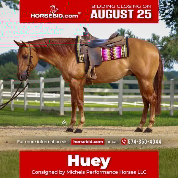 ⭐️ 𝐀𝐔𝐆𝐔𝐒𝐓 𝓐𝓵𝓵 𝓢𝓽𝓪𝓻 𝓛𝓲𝓷𝓮𝓾𝓹 ⭐️ Happening now thru MONDAY | AUGUST 25th - Available EXCLUSIVELY on HorseBid's website! For more details and to register visit: www.Horsebid.com CONSIGNOR CONTACT: Michels Performance Horses LLC 574-350-4044 LOCATION: River Falls, WI BREED: AQHA REGISTERED: Yes REGISTERED NAME: Dunspookable COLOR: Red Dun HEIGHT: 15 AGE: 6 GENDER: Gelding Meet Huey, a stunning 6-year-old red dun gelding standing at 15 hands tall, with a strong, compact build and a calm, willing demeanor. Registered with the AQHA as Dunspookable, Huey is sired by the legendary Smart Spook and is an NRHA money earner with a bright future still ahead—he has one more Derby year left. With his exceptional bloodlines, proven show record, and natural athleticism, Huey is the total package. He is a finished reiner and ranch riding horse, with flawless lead changes, lightning-fast spins, and a huge, deep stop that turns heads in the pen. Whether you're looking to be competitive in the show ring or want a broke, talented gelding for all-around work, Huey delivers with consistency and style. Huey is as safe and sane as they come—completely bombproof and level-headed in all environments. He’s been exposed to traffic, dogs, machinery, and wildlife without batting an eye, and he handles it all with quiet confidence. He's equally reliable out on the trail, surefooted and relaxed whether he's leading, following, or riding out alone. He has no vices or bad habits: no buck, bite, rear, cribbing, or weaving, and he stands tied, loads easily, and is respectful on the ground. He is 100% sound and up to date on all vaccinations, dental work, deworming, and farrier care. Huey would make an excellent mount for any rider—youth, amateur, or experienced horseman—looking for a well-rounded, trustworthy partner. Whether you're headed to the show pen, checking fences, or just enjoying a quiet ride down the trail, Huey is ready to go to work. This exceptional gelding is now offered for sale to a great home.