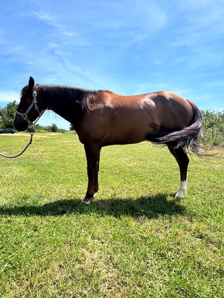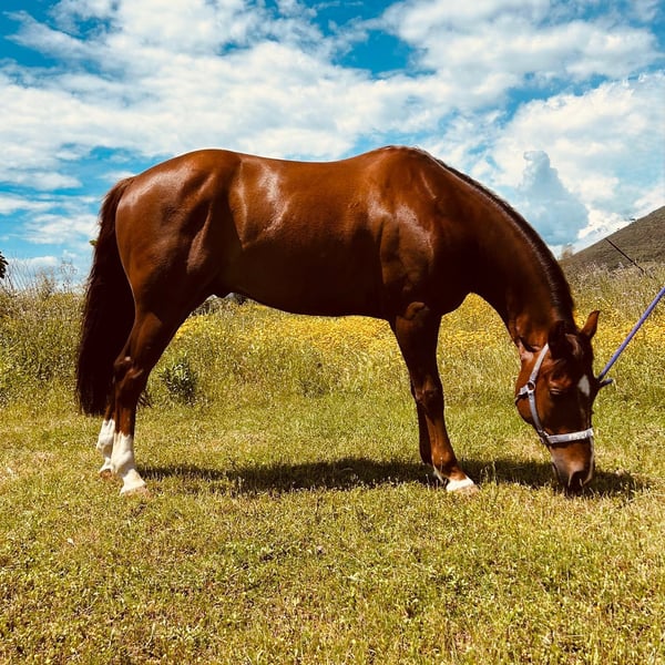 Five-year-old American Quarter Horse with a chestnut coat, trained in reining, also showing good aptitude for mountain trail riding. A horse with a strong build and striking presence. Good reining maneuvers and potential for sporting growth. - Pedigree: direct Electric Snow - Solid conformation, power, and physique - In excellent health - No vices (no pawing, no cribbing) - Smooth riding, regular and comfortable movements - Easy to handle on the ground, reliable in various situations - Also well-suited for other disciplines such as Mountain Trail