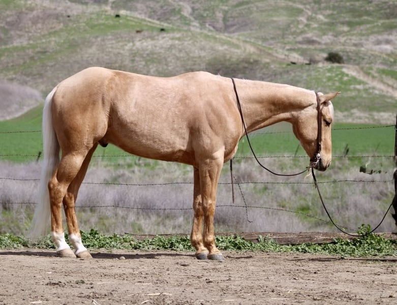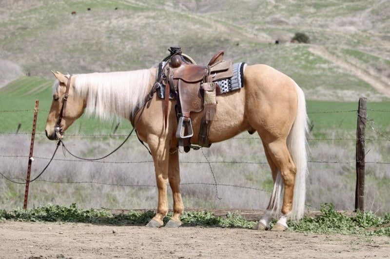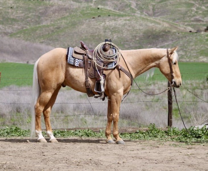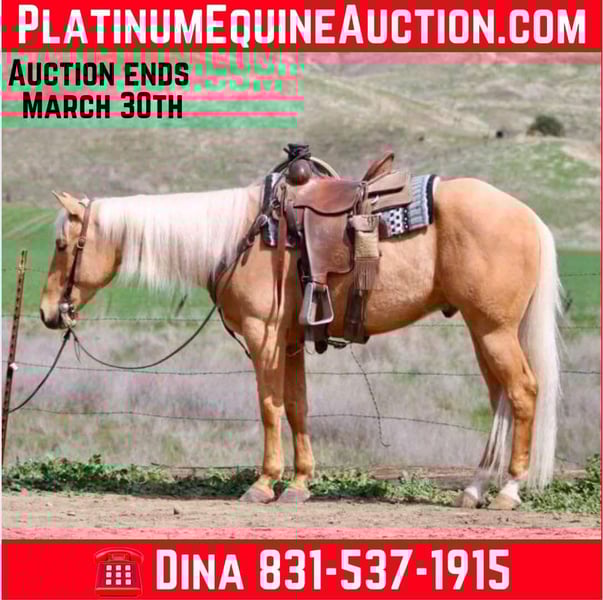 ONLINE AUCTION Place your bids at www.PlatinumEquineAuction.com Starting Bid $3500 Auction ends March 30th, 2025 Need a new saddle? Check out White Rock Saddles on our website or Facebook! Dorado is truly a one-of-a-kind horse that you don’t want to miss out on. With his beautiful palomino gold coat and flowing long mane, he is a stunning sight to behold. Standing at 15.1 hands tall and 5 years old, he has the kindest and sweetest personality that you will ever encounter in a horse. One of the most remarkable things about Dorado is how safe he is. You can trust him completely when riding as he has the soul of a true saint. Dorado remains calm and composed at all times, making it easy for anyone to take him anywhere they desire. He has been on countless trail rides and can easily navigate through any terrain – be it hills, branches, or water – with confidence. Dorado has been used on the ranch and is asset to have in the barn. He is the one you can trust with anyone and will get the job done. Gathering. Branding or just checking the cows this boy is ready to help. In the arena, Dorado is nothing short of a dream horse. He rides collected and soft, picks up leads effortlessly and responds to even the lightest touch. His back-up and turn around are smooth and easy. He truly embodies what every rider looks for in an ideal mount as far as obstacles go, there’s nothing that fazes Dorado! This seasoned horse can tackle anything thrown his way, From walking over bridges and tires to riding through covered wagons and pool noodles – nothing seems too daunting for this brave horse. He’s also unfazed by blowy tarps, flying flags, or bouncy balls; in fact, he takes everything in stride while remaining peaceful throughout. Traffic, bickers and trucks no problem Dorado couldn’t care less about them; instead, he calmly rides alongside cars without any hesitation or fear.Dorado’s ground manners are impeccable – just like his riding skills! He stands tied without fussing around and loves being fussed over by his human companions. In fact, he’s such a friendly and affectionate horse that loves nothing more than attention.Whether you’re a beginner or an experienced rider, Dorado is the perfect horse for anyone who wants a safe and reliable companion. He rides alone or in groups, adapts quickly to stall or pasture life, tacks up easily, and is a dream to handle on the ground. This rare find truly has something for everyone. Don’t miss out on this amazing opportunity to bring home the one and only Dorado. Contact Longhorn Ranch, Dina today at 831-537-1915 and make this incredible horse a part of your family! Located in Paicines, CA, we assure you that you won’t be disappointed with what this gem of a horse has to offer. ONLINE AUCTION Place your bids at www.PlatinumEquineAuction.com Starting Bid $3500 Auction ends March 30th, 2025 Need a new saddle? Check out White Rock Saddles on our website or Facebook!