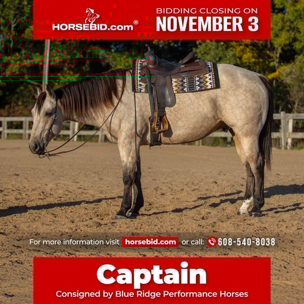 ⚜️𝐓𝐇𝐄 𝐅𝐀𝐋𝐋 𝐇𝐄𝐑𝐈𝐓𝐀𝐆𝐄 𝐂𝐋𝐀𝐒𝐒𝐈𝐂⚜️ Happening now thru MONDAY | NOVEMBER 3rd - Available EXCLUSIVELY on HorseBid's website! For more details and to register visit: www.Horsebid.com CONSIGNOR CONTACT: Blue Ridge Performance Horses 608-540-8038 LOCATION: Mayfield, KY BREED: AQHA REGISTERED: Yes REGISTERED NAME: JT MR DOC BAR ONE COLOR: Buckskin HEIGHT: 15.2 AGE: 5 GENDER: Gelding Check out this beautiful big-broke gelding we call Captain! This sweet boy has been raised with us in our training program since the very beginning, with correct conformation, big bone, lots of body, athletic ability, and striking good looks he turns heads everywhere he goes! Caption Just recently finishing 2 years of professional reining and ranch riding training and just starting his show career this last season! ( with points in ranch riding and conformation classes) Captain executes effortless correct turnarounds, easy changes, nice rollbacks, smooth transitions, and big, deep stops! Captain is also a proven trail deluxe, used for camping and trail riding throughout most of his life. Furthermore, he's been used as a lesson horse this past year and has proven to be great with beginners. Captain will never turn down a spa day, standing calmly for grooming, trimming, and baths. He's also good for trailering and will stand tied all day. Captain sells 100% sound and is up-to-date on vaccinations and Coggins; PPEs are welcomed! Selling due to no fault of his own, we've switched to more specialized reining and don't see him enjoying the higher level reining shows. Captain has been roped off of and would make an exceptional header or rope horse prospect with his size and ability to get up and go. Contact Bili at 608-540-8038 for more information about Captain today!