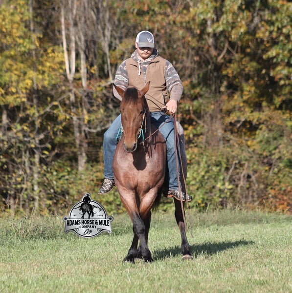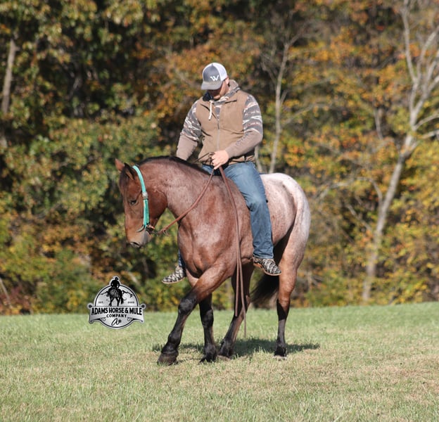 Go to visit our website for more pics and a video www.AdamsHorseAndMuleCo.com AHAMC has been in the horse business and sold horses over the internet since 2005. We have a long track record of success with hundreds of happy customers. We work hard to match riders with the correct horses and specialize in beginner safe, family friendly horses that have been used and checked out by our family! We can set up transportation anywhere in the US and look forward to working with you.Meet Reno, a super cool, stout built, bay roan, draftcross gelding that is standing around 15.2hh. He will weigh 1250lbs, he is 5 years old and he has all the good looks, and (the best part) the mindset that anyone could ask for! Not only does he look cool, he has all of the other boxes checked as well… he is Mr. Personality, as friendly as they come, loves attention and is very calm natured. Reno has been ridden by every member of our family all the way down to our 6 year old and he will be the perfect horse for the whole family to enjoy! He is the same horse whether ridden daily or if he is left off for a couple months. He has been ridden around the ranch, checked cows and pushed them around. Reno is great on trails and he will cross creeks, ditches, logs and navigate rough rocky areas. He has a smooth jog, one of the slowest and softest lopes that you will find, a good stop and reins around as well! He has been exposed to all kinds of wildlife such as deer or turkey and will go anywhere that he is asked too. He has been ridden many miles in the mountains of Eastern Kentucky and encountered every obstacle possible on the trail. He will go up or down even the steepest slopes, across deep creeks, over downed trees, and over all types of rough terrain while still being sure footed. He is also harness broke and has been used in all types of farm machinery. Reno is not cinchy, cold backed, does not crib or weave. If you need your confidence boosted, Reno is the one for you!!! Feel free to call Eric 606-308-2461 with any questions.