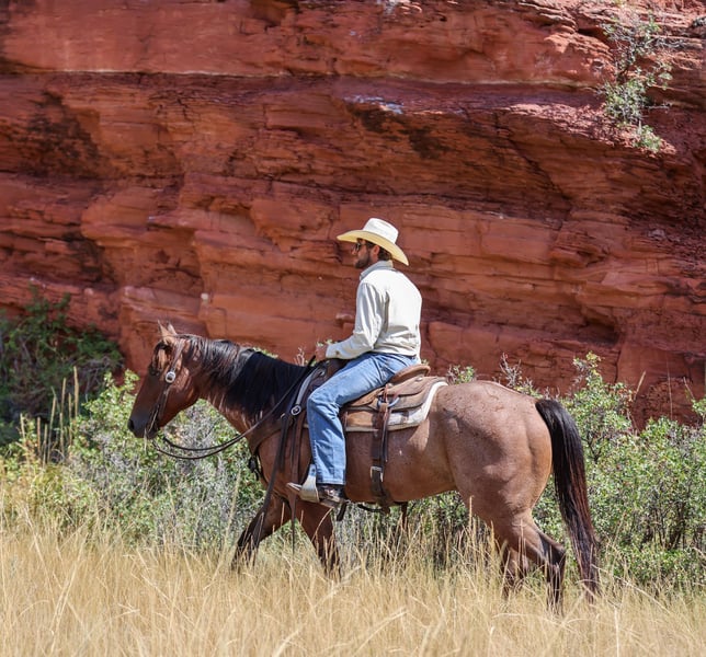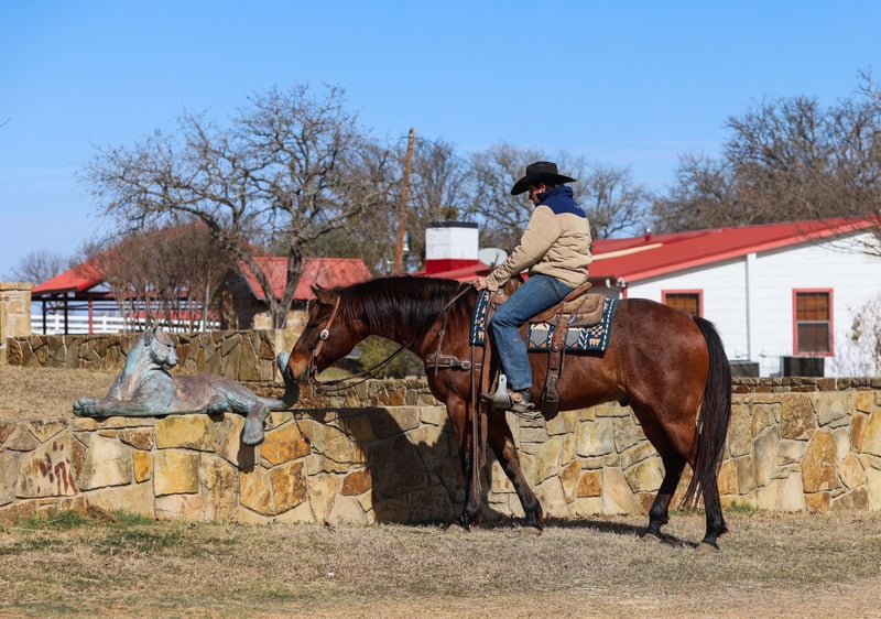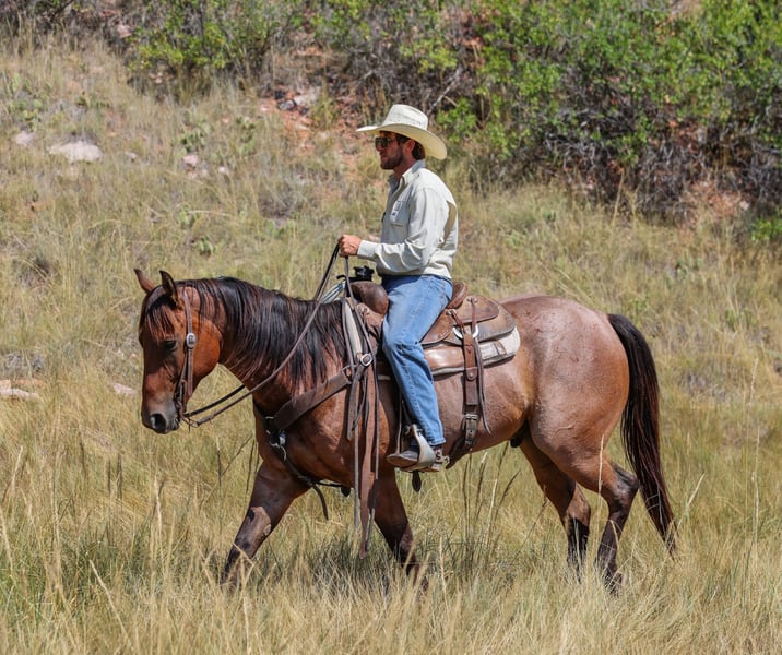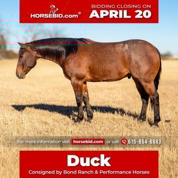 ⚜️𝐭𝐡𝐞 𝓔𝓵𝓲𝓽𝓮 𝐒𝐩𝐫𝐢𝐧𝐠 𝐂𝐥𝐚𝐬𝐬𝐢𝐜⚜️ Happening now thru MONDAY | APRIL 20th - Available EXCLUSIVELY on HorseBid's website! For more details and to register visit: www.Horsebid.com CONSIGNOR CONTACT: Bond Ranch & Performance Horses 615-854-6883 LOCATION: Ranger, TX BREED: QH REGISTERED: Yes REGISTERED NAME: Duckcreek Traigo COLOR: Bay Roan HEIGHT: 15.2 AGE: 6 GENDER: Gelding A true gentleman, Duckcreek Traigo, “Duck” — a captivating bay roan gelding bred to last, built to work, and stamped with the classic, timeless look everyone is searching for. Big-bodied with a kind eye and a quiet, agreeable mind, Duck is easy to keep, easy to ride, and even easier to love. He is every bit as versatile as he is talented — our true go-to gelding for any job on the ranch. Between catching wild cattle, sorting, branding, and pasture doctoring, Duck is guaranteed to keep you safe and smiling. Whether you are an experienced hand or a more novice rider, you will appreciate the quality, feel, and honesty this gelding offers. On the trails and in big country, Duck is steady, thoughtful, and sure-footed, with a ground-covering walk that makes long miles enjoyable. He picks his way through rocky terrain, crosses water willingly, and will climb any mountain you point him toward. He pays close attention to his surroundings and always takes care of his rider. From the bustle of city streets to the Texas hill country and the mountains of Colorado, Duck has proven himself confident, consistent, and reliable in every environment. He rides out alone or will happily lead a group, and he has been exposed to whips, gunfire, wildlife, machinery and dogs with no issue at all. Duck is the kind of using gelding that can go straight to work, while staying gentle and user friendly. His foundation pedigree, size, color, and disposition make him stand out — a true ranch-horse type with the talent to shine in the arena or be a trusted lifelong trail partner. Duck has the sweetest personality and always wants to please! He’s easy to catch, trailer, bathe, clip, shoe etc. Duck has a health exam and full set of clean X-rays on file and is UTD on deworming, vaccines, dental and farrier work. For more information please text or call Morgan at 615-854-6883.
