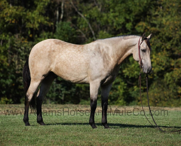 This horse sells in Cannon Falls, MN on February 1st and is consigned to www.NorthStarHorseSale.com you can bid online, bid in person and come preview each horse and ride them yourself before bidding. Shipping is available anywhere in the USA. $5000 starting bid, all horses sell sound. Jewell’s Pardee is the life of the party and will be the center of attention! With his high contrast buckskin coloring, pretty dapples and personality he sparks folk’1s attention from all angles! Pardee is a well built 15.3hh, 2020 model, registered APHA, Buckskin Gelding. His name might suggest that he’s just here for a good time but he knows how to go to a job and how to get it done the right way! Pardee can do anything from slow easy trail rides packing saddle bags full of beverages to pasture roping/doctoring, he can push the cows around and hold anything that you tie to the horn. If you want to come out of the box, Pardee knows how to turn a steer and has a done good roping on the head side. If you just want to enjoy those long slow miles on the trails with your friends, Pardee can babysit anyone in the family as he is perfectly content to just mosey along slow and easy. He will cross creeks, deadfall, rough rocky areas and scale steep slopes. Pardee is one hand broke, he reins around with ease, has a big stop and lopes very nice circles on the correct lead. Pardee is easy to ride and is safe for all levels whether you use him daily or once a month. Climb on, set back and enjoy this Pardee! Feel free to call Eric 606-308-2461 with any questions.