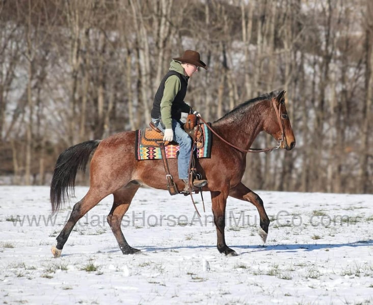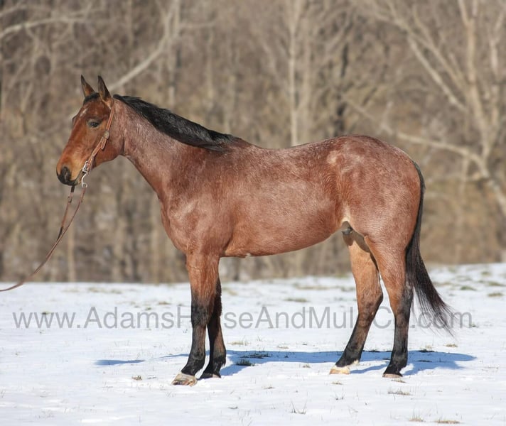 Go to visit our website for more pics and a video. AHAMC has been in the horse business and sold horses over the internet since 2005. We have a long track record of success with hundreds of happy customers. We work hard to match riders with the correct horses and specialize in beginner safe, family friendly horses that have been used and checked out by our family! Diagonal Hancock is a beautiful Bay Roan that is very stout built, standing 15.3hh and he is a 2020 Model Registered AQHA Gelding! Since back in the Summer DH has been with a family who has a small cow/calf operation. He has done some of it all from sorting to roping and doctoring. But DH’s main job has been toting the kids around the place and down the trails. DH is a gentle type of horse that is never in a hurry! He lopes nice slow circles, catches the correct leads, has a good stop and reins around. DH is content to mosey along down the trail and loves going on trail rides. He will cross creeks, ditches, logs and navigate rough rocky areas. DH has been exposed to all kinds of wildlife and will go anywhere that he is asked too. He has been rode many miles in the mountains and encountered every obstacle possible on the trail. He will go up or down even the steepest slopes, across deep creeks, over downed trees, and over all types of rough terrain while still being sure footed. DH has been ridden down the highways and is traffic safe as well. If you need a broke, quiet, gentle, safe horse for ranch or trails… DH is your guy! Call 606-308-2461 with any questions.