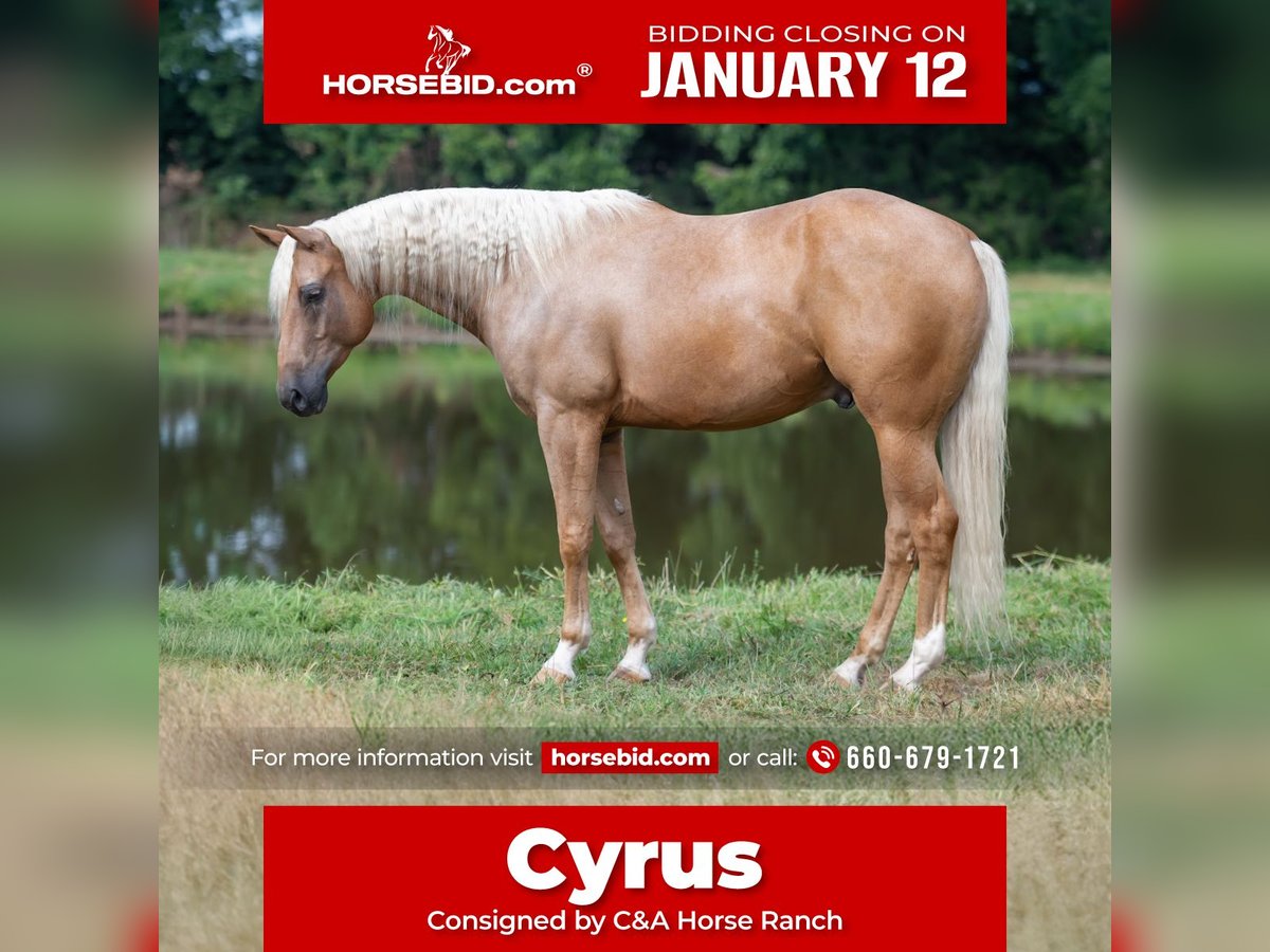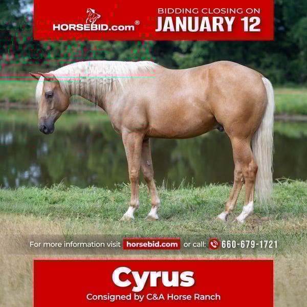♦️𝐍𝐄𝐖 𝐘𝐄𝐀𝐑'𝐒 𝑬𝒙𝒕𝒓𝒂𝒗𝒂𝒈𝒂𝒏𝒛𝒂♦️ Happening now thru MONDAY | JANUARY 12th - Available EXCLUSIVELY on HorseBid's website! For more details and to register visit: www.Horsebid.com CONSIGNOR CONTACT: C&A Horse Ranch 660-679-1721 LOCATION: Rockville, MO BREED: Quarter Horse REGISTERED: Yes REGISTERED NAME: Commanders Fancy Eye COLOR: Palomino HEIGHT: 16 AGE: 6 GENDER: Gelding We are proud to offer a gelding that is more like family than just a horse. We have had the pleasure of owning Cyrus since he was a yearling and we are so excited to show you just how special he is. Cyrus is a 6-year-old registered AQHA gelding that stands 16h and weighs 1300 lbs. His fun personality is just as big as he is! Over the years of owning and training Cyrus, we have taken him on many trail rides throughout Missouri and used him in the Colorado Rocky Mountains to pack elk and goods to dry camp. He is a very versatile gelding that has seen and experienced a little bit of everything! A large portion of Cyrus' training was spent with a reining trainer, where he received a phenomenal foundation. Don't let his size fool you, his athletic ability is astounding! His trainer continuously commented on how impressively Cyrus handled himself when doing reining maneuvers. Cyrus is sired by Yes Eye Can, who has AQHA points in heading and heeling. Cyrus' dam was shown and has earnings in reining. He is HPI eligible! We have used Cyrus to gather and sort cow/calf pairs, he has worked gates and is used to roaring 4 wheelers and ATVs. We have even shot pistols off of him! Cyrus learns quickly, and after being exposed to anything once, he picks it up like he has done it for years. We have overnight camped with him many times, from trail rides to hunting trips. Cyrus is hobble broke and has no hesitation when packing out your trophy bull elk. He willingly crosses rivers and will take you through deep currents without any coaxing. Cyrus has already had a lifetime of experiences and has built a solid foundation because of it. No matter what you want to do with him, he has the versatile talent to compete in it all, he is truly an all-around type of gelding. Whether you prefer English riding, mounted shooting, team roping, barrel racing, reining, ranch horse versatility, trail riding, or just a family horse...Cyrus has the ability to do it all. Cyrus has all of the eye appeal and talent for the show pen. He has a correct turn around with all of the speed you could ask for. He picks up his leads correctly and on cue, has a nice departure, a smooth flying lead change, and lopes pretty circles. He has a beautiful extended trot, a nice stop, and will even side pass to the mounting block (or anything you need to use to mount him from). He collects, riding on a loose rein, responding to your seat and leg. Cyrus is soft in the bridle and body. He has excellent body control, moving his hips or shoulders when cued. Cyrus is the type of horse that will speed up if asked but will also be slow and quiet when asked. He is an honest gelding who truly aims to please. Cyrus is in your pocket and will be your best friend; he is respectful and has the ground manners of a gentleman. He absolutely loves people and attention. Our granddaughter loves to sit on Cyrus and spoil him with affection; and we know that she is safe with him. He has been ridden by intermediate children and intermediate to advanced adults. It can easily be said that Cyrus steals everyone's hearts, as he is so easy to love and enjoy. He is traffic safe, used to all of the commotion at campgrounds, and has even been ridden through the town square as vehicles and pedestrians passed by. He is also used to being around children of all sizes, small and large pets, wildlife, poultry, and livestock (even a pet pig!). He loads and hauls well, even when traveling hundreds of miles. Cyrus stands tied and ground ties to be groomed and tacked up. He lowers his head to be haltered and bridled, making things so easy no matter how short or tall his rider is. He is a gentleman for the farrier and veterinarian. Cyrus does wonderful whether he is stalled or turned out. He is happy by himself, or with pasture mates and gets along well with everyone. He is easy to catch and will always be the one to meet you at the gate; he is truly one of the most personable horses we have ever had the privilege to be around. Cyrus will come with a current Coggins, Pre-Purchase Exam and a Certified Veterinary Inspection. He is current on his deworming schedule and current with the farrier. Many of the attached photos are from throughout the past 5 years of owning him. We are happy to help you arrange shipping and can pair you with an insured nationwide shipper. If you have any questions or would like to meet Cyrus prior to the auction ending, please contact Chad at 660-679-1721. We want to ensure that Cyrus is a great fit for his new owner and goes to the perfect home where he will be happy and loved; so please do not hesitate to reach out. We look forward to hearing from you, and God Bless!
