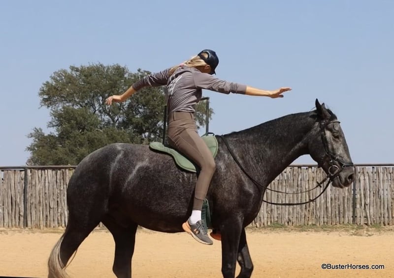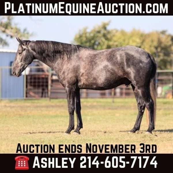 ONLINE AUCTION Place your bids at www.PlatinumEquineAuction.com Starting Bid $3500 Auction ends November 3rd, 2024 Need a new saddle? Check out White Rock Saddles on our website or Facebook! “Georgie” – 16.1H, 4 year old gray Lusitano / Percheron / Quarter horse cross gelding. Georgie is exceptional and is going to make someone a once in a lifetime “heart” horse. He has a big goofy personality and is super sweet, affectionate, loving, and kind. He is a big fresh clean slate. He has been in exceptionally good hands and is ready to finish your way. He was started outside and he has had tons of big open using miles covering ground on a big piece of land letting him mentally and physically mature and he is mature beyond his years and very solid minded. He is a very talented mover and would be a great event prospect, dressage prospect,.or could be finished out to go to the hunter jumper shows as well. We have hauled him out to schooling shows and he hops right on the trailer and stands tied next to the trail like a seasoned professional – even when left tied alone! He is very relaxed in new environments and is happy to see the new sites and sounds. He is a pleasant horse – always nice to be around and to have along with you. He is never worried whatsoever – he is relaxed, no drama, and no hassle. He is very suitable for a youth or amateur rider to season and finish on their own underneath a trainer. He is an easy uncomplicated ride and has big balanced comfortable smooth gaits. He is great to be around on the ground good with his feet easy to shoot easy to clip bathe saddle bridle and stands very relaxed for Mount and dismount. He loves to go out on the trail and rides very comfortably bareback. He adores the creek and the pond! Check out his videos and don’t miss out on a horse that will last someone a lifetime. He is just now maturing into his legs and we cannot wait to see what the source looks like as a fully mature 6 year old! He is already so naturally balanced and such a big floatey mover! To see additional videos, go to our website: BusterHorses.com or our Facebook page Buster Horses Please call anytime for more information at Buster Horses Ashley 214-605-7174 Georgie is located in Weatherford, TX – one hour from Dallas / Fort Worth International Airport. He is an easy day trip or fun overnight trip to come try out, from anywhere! We are experienced, knowledgeable sellers, and we can help with quickly arranging affordable shipping to any buyer’s location – we have experience shipping worldwide – including regularly to Hawaii, Canada, Mexico, Europe, and South Africa. ONLINE AUCTION Place your bids at www.PlatinumEquineAuction.com Starting Bid $3500 Auction ends November 3rd, 2024 Need a new saddle? Check out White Rock Saddles on our website or Facebook!