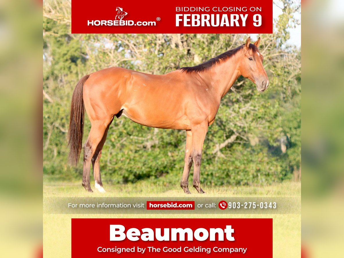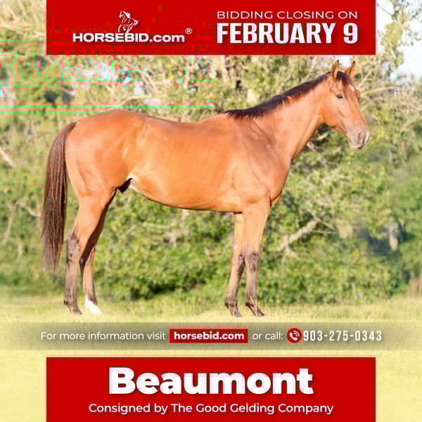 ❤️🔥𝑩𝒆 𝑴𝒊𝒏𝒆 𝐒𝐄𝐋𝐄𝐂𝐓❤️🔥 Happening now thru MONDAY | FEBRUARY 9th - Available EXCLUSIVELY on HorseBid's website! For more details and to register visit: www.Horsebid.com CONSIGNOR CONTACT: The Good Gelding Company 903-275-0343 LOCATION: Athens, TX BREED: Appendix REGISTERED: Yes REGISTERED NAME: GGC Beaumont COLOR: Bay HEIGHT: 17 AGE: 6 GENDER: Gelding GGC Beaumont, known around the barn as Beaumont, is a striking 17-hand blood bay Appendix gelding with the size, presence, and temperament to excel in a variety of programs. He is a well-rounded, quality individual who has been thoughtfully trained and is ready to continue his education with his next partner. Beaumont has been trail ridden and is confident and sensible outside the arena. He has also been pleasure ridden western, showing a relaxed, easygoing way of going, and is equally comfortable under English tack. He has been started over fences and shows a great foundation on the flat, including a reliable simple lead change with a flying change introduced and coming along nicely. This gelding gets along well with other horses and is uncomplicated in his management—he is happy living in a stall or turned out. His ground manners are excellent, and he is a pleasure to handle in all aspects of daily care. Beaumont has a sweet, people-oriented personality and genuinely enjoys attention, making him an easy and enjoyable horse to have around the barn. With his size, athleticism, and kind demeanor, Beaumont would make a lovely family horse or an excellent prospect for a rider looking to bring along a quality hunter or jumper. He offers a combination of scope, versatility, and a good mind, making him suitable for a wide range of riders and goals. Beaumont is the type that stands out—both for his presence and his temperament—and is ready to continue his career in a program that will appreciate his potential.