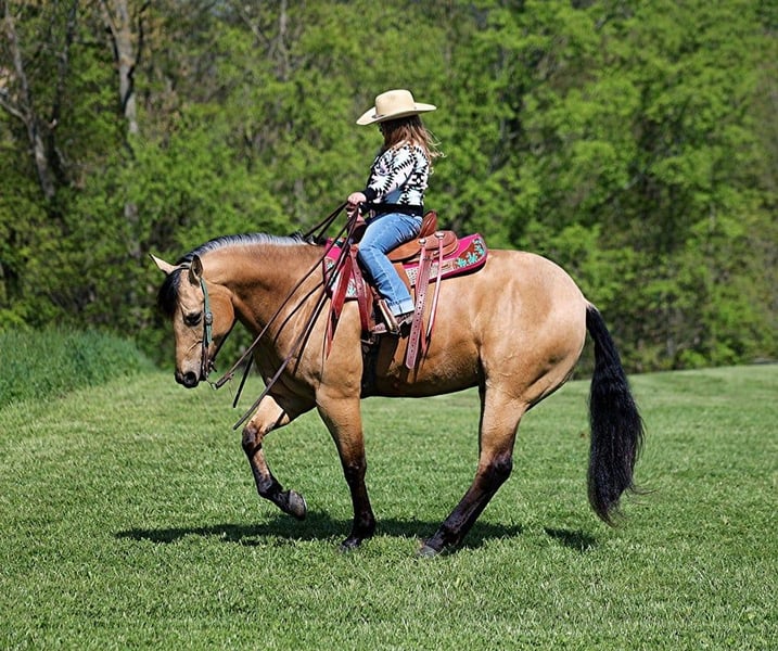 Consegnato alla Cowgirl Cadillacs di Sheridan, WY. Vendite il 14-15 giugno. Potete fare offerte online, telefoniche o di persona! La scuola è finita e date un'occhiata alla pagella di STE SHINING DIAMONDS: ha preso una "A" in ogni categoria, pur avendo tutte "B"... GRANDE, BELLISSIMO, BRAINS, BROKE e BUCKSKIN!!! Shiner è un robusto castrone di oltre 15,2 hl, di 5 anni, pelle di daino dorata, registrato AQHA! Ha un ottimo pedigree con MR RED BARON, TWO EYED RED BUCK e SHINING SPARK sui suoi documenti. Shiner ha fatto di tutto mentre lavorava al feedlot, dallo smistamento, al roping/dottorato, al carico dei camion e al recinto. Non è estraneo alle luci, agli altoparlanti e alle folle, poiché è stato trasportato ai rodei dei ranch e ha partecipato a tutti gli eventi. Ha partecipato a gare di selezione a squadre e Shiner è stato avviato al roping. È stato addestrato per il reining e sarebbe un eccellente cavallo per gli spettacoli nei ranch. Shiner è un bel ragazzo, ma gli piace anche uscire sui sentieri e sporcarsi! È stato cavalcato in terreni accidentati, rocciosi e con forti dislivelli. Si prende il suo tempo e sceglie dove mettere le zampe, con la massima attenzione e cura che un cavallo possa avere. Attraversa acque profonde, fanghi paludosi, superfici rocciose scivolose e supera agevolmente le cadute. Shiner è un cavallo rilassato e gentile, che si accontenta di passeggiare lungo i sentieri con i bambini che lo cavalcano e che ama fare passeggiate. È in grado di attraversare ruscelli, fossati, tronchi e di attraversare aree rocciose. È sicuro di cavalcare in città e in tutti i tipi di traffico. Ha un'andatura fluida, un'andatura molto piacevole, un buon arresto, gira in entrambi i sensi, passa di lato e indietreggia con facilità! Shiner è stato esposto a tutti i tipi di animali selvatici e non è spaventato. Ha molta personalità, ama l'attenzione ed è stato cavalcato in tutto il nostro ranch dai bambini ed è sicuramente adatto a cavalieri di tutti i livelli di abilità! Shiner è un cavallo in grado di fare qualsiasi lavoro gli venga richiesto, di farlo con facilità e di essere bello mentre lo fa! Prendete carta e penna e preparatevi a dargli la vostra pagella... Crediamo che gli darete tutte A proprio come abbiamo fatto noi!