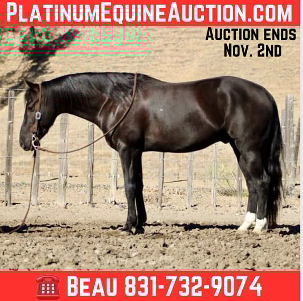 ONLINE AUCTION Place your bids at www.PlatinumEquineAuction.com Starting Bid $3500 Auction ends November 2nd, 2025 Need a new saddle? Check out White Rock Saddles on our website or Facebook Looking for a horse that turns every ride into a good time? Meet Blackjack, a 5-year-old black gelding standing 14.3 hands and built just right. He’s been both headed and heeled on, showing all the makings of a top-shelf rope and ranch horse. In the box, he’s solid and honest — leaves flat, runs straight to the hip, and gives you the same steady shot every trip. He’s got that perfect blend of speed and feel: quick when you ask, quiet when you don’t. Low-headed, soft, and correct, he makes everything you do feel smooth and easy. I’ve had the pleasure of owning and giving Blackjack the solid foundation he carries today, and he’s truly been a joy to work with — the kind you look forward to riding. Watching him grow into a seasoned, confident, dependable partner has been nothing short of rewarding. He rides like one twice his age — steady-minded, safe, and always willing to step up. Whether you’re sorting cattle, doctoring, or gathering in the rough, he’s the same cool-headed partner every time. He’s that super-chill, go-with-the-flow kind that makes ranch work downright fun. He’s been through steep country, brush, water, and wildlife without missing a beat. Traffic, bikes, strollers, tarps, flags, and bouncy balls don’t even raise an eyebrow — if it flaps, rolls, or honks, Blackjack’s already seen it and didn’t care one bit. Easy to catch, tack, haul, and shoe, he’s as pleasant in the barn as he is out on the trail. Stall or pasture — he doesn’t mind either way. No fuss, no drama, just a good-minded gelding that shows up the same every single day. If you’re after one that’s safe, broke, and plain fun to ride, Blackjack’s your guy — the kind that keeps a cool head, gets the job done, and makes you smile while he’s doing it. Contact Beau Mendala 831-732-9074 with any questions. Located in King City, CA. ONLINE AUCTION Place your bids at www.PlatinumEquineAuction.com Starting Bid $3500 Auction ends November 2nd, 2025 Need a new saddle? Check out White Rock Saddles on our website or Facebook