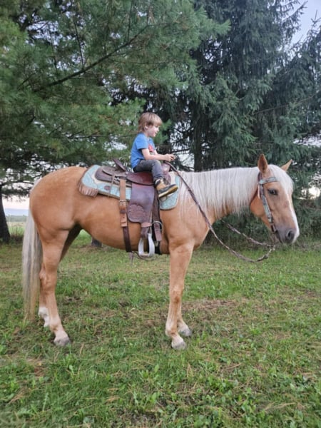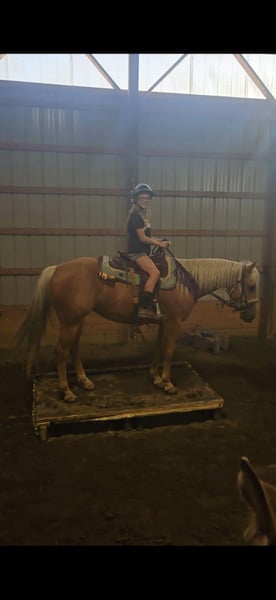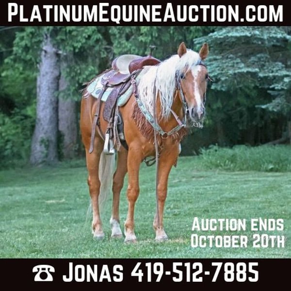 ONLINE AUCTION Place your bids at www.PlatinumEquineAuction.com Starting Bid $3500 Auction ends October 20th, 2024 Need a new saddle? Check out White Rock Saddles on our website or Facebook! Taris Crazy Cat Is a Dappled Palamino 2019 registered American Quarter horse mare that has the type of pedigree that most envy greatly! Her great grandsire on her dams side.. HIGH BROW CAT has produced over 82 MILLION doolars! Her other great grandsire on her dams side…PEPTOBOONSMAL has produced more than 27 MILLION dollars! Her grandsire on her dams side is BOONLIGHT DANCER…who has produced 1.5 MILLION dollars! Her Great Grandsire on her sires side is…DOC TARI who has produced 4 MILLLION dollars! Taris Crazy Cat earned her barn name Barbie simply from her gorgeous color, big round hip, and stocky physique. No matter where this mare goes she always turns heads as soon as she walks out of the trailer! Barbie may only stand a touch over 14.2 hh but, don’t let her size fool you she is built like a brick house and can out perform most horses much larger than her! She is also heavily reined cowbred and most of the more competitive horses in this discipline including the notorious. HIGH BROW CAT (Barbie boasts on her pedigree) stood half a hand shorter than Barbie is! With the foundation Barbie has on her she would be perfect for just about any discipline and she would make one heck of a future broodmare prospect down the road. She has been started on the flag, live cattle and shes also has been roped off of as well. She is a very willing responsive partner and has great verbal cues for when less experienced riders ride her. Barbie has an incredible knack for adapting to her riders riding ability and can go from carefully toting around a small kid to chasing down a cow without missing a beat. She has a smooth walk/trot/lope, knows how to change leads well, has an awesome sliding stop, a quick CORRECT spin, does rollbacks, and can be ridden with or without spurs or even a bit! She is a well broke mare that has been used for riding lessons in the arena or out on the trail! Barbie has also been on a 4 day 3 night trail ride at Pleasant Hill LAke Park where she put in over 35 miles. During that trip she was ridden by some beginners as well as some intermediate riders without issue. On one of the rides Barbie completed she rode all the way to Mt.. Geez during which she crossed roads, rivers, passed by cars/trucks, and went through some very rough terrain. Barbie is a very brave mare and will go any direction you point her. She is also very trustworthy when crossing a rivers, bridges, logs, muddy spots, up/down steep hills, or just through rough terrain in general. She also been ridden in English tack and will even go over jumps without hassle. Barbie has also been ridden by kids as young as 7 years old and lesson students are even able to practice getting her to bow on command, have ridden COMPLETELY bridleless, and even bareback without issue. Barbie will tie on a highline overnight, cross over over any obstacle and has very good manners. We have lots going on at our facility like tractors, cats, kids, dogs, side by sides, and even a back hoe and shes never been bothered by any of it. Barbie is a super sweet mare that gets along with just about any horses, even drafts, weanlings and ponies. If you’d like to schedule a day to come meet and ride her at our facility in Ashland Ohio, call or text Jonas Miller 419-512-7885. ONLINE AUCTION Place your bids at www.PlatinumEquineAuction.com Starting Bid $3500 Auction ends October 20th, 2024 Need a new saddle? Check out White Rock Saddles on our website or Facebook!