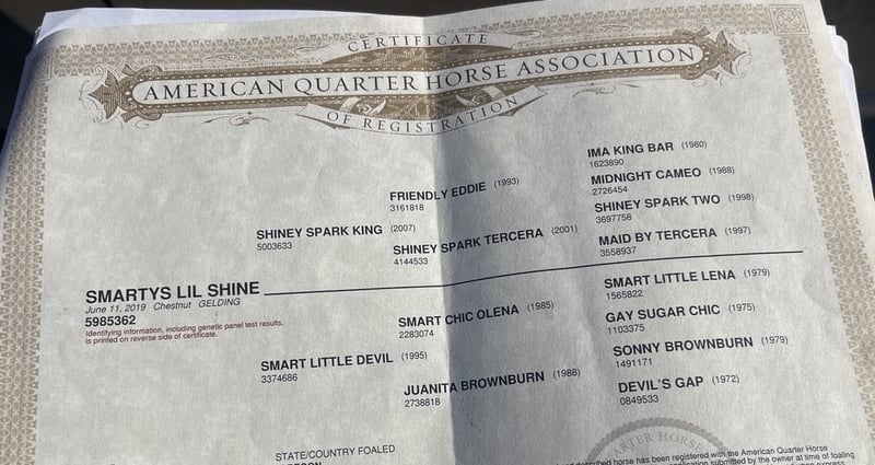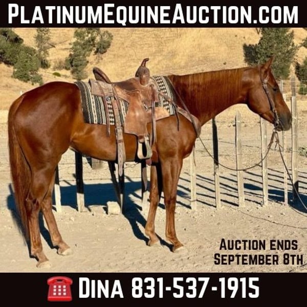 ONLINE AUCTION Place your bids at www.PlatinumEquineAuction.com Starting Bid $3500 Auction ends September 8th, 2024 Need a new saddle? Check out White Rock Saddles on our website or Facebook! Smarty’s Lil Shine is a 2019 AQHA Gelding that’s 15 hands. This boy has a phenomenal pedigree with some great Bloodlines going back to Shining Spark and Smart Little Lena. This is a kind extremely gentle boy. Shine is suitable for youth riders, beginner, husbands or novice. Shine is also handy enough for anyone who just wants a horse they can trust and never have to worry about. Shine was in reining training and he has all the talent you would want. The best part of this horse is his kindness and willingness. Shine rides low headed and very collected. He is fluid in all of his gates picks up the correct leads and a nice sliding stop. Shine also moves off leg cues, yields his hindquarters and has a perfect correct turn around. Shine is a horse that wants to be your best friend and will meet you at the gate. This boy has everything you would want in a horse and he is talented. Shine loves going out on the trail and will ride alone or in a group setting. He has gathered, branded,and sorted pairs he will do anything asked of him. He will go anywhere you ask on the trail up or down any trail, through thick brush, over logs, and cross deep creeks. Shine is very cowy and really wants to work. Shine has roped the sled and really has taken to it he would make a jam up rope horse. Shine is so quiet minded that nothing phases him. Shine has been around tarps, balls, flags and could care less about any of if. He has been over all the obstacles bridges, car wash, tires and handles them like a seasoned veteran. He has been ridden in town and is safe around traffic, bikes and pedestrians. He has a one of kind personality and will follow you like a dog, if he could he would fallow you in the house and sit on the couch and watch tv. This horse is a rare find that the entire family will enjoy. Shine clips, ties, bathes and hauls well. He is super easy to tack up and enjoys being groomed. Shine has zero bad habits and handles time off well retains his training and is eager to please. This is one of my personal favorites and I have enjoyed him so much. Shine will last a lifetime and will be the best you have ever owned. This fun boy is up for any challenge he could go to the show pin, sorting, ranch trail, play day horse and a superior trail companion. He is an absolute character he will grab water bottles and play with them pick up things off the ground and play he’s so much fun. This horse adores children he puts his head down and fallows them anywhere. He loads and hauls great and will run to you when out in the pasture not many horses have this personality. Shine is ready to become a part of the family! If you would like to come meet Shine or have any questions please contact Longhorn Ranch Dina 831-537-1915 Located in Paicines, CA. ONLINE AUCTION Place your bids at www.PlatinumEquineAuction.com Starting Bid $3500 Auction ends September 8th, 2024 Need a new saddle? Check out White Rock Saddles on our website or Facebook!
