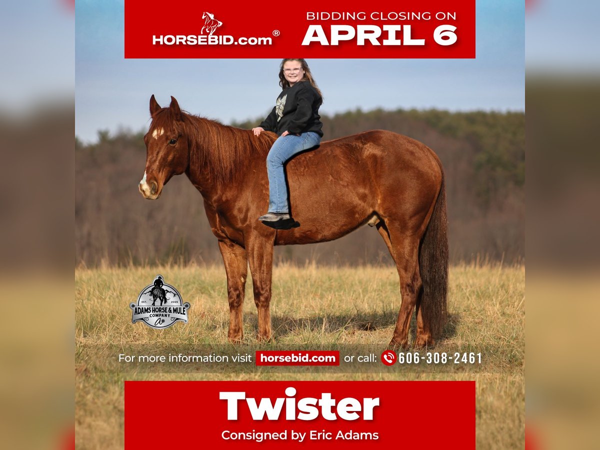 🌟𝑨𝒑𝒓𝒊𝒍 𝐀𝐋𝐋 𝐒𝐓𝐀𝐑 𝐋𝐈𝐍𝐄𝐔𝐏🌟 Happening now thru MONDAY | APRIL 6th - Available EXCLUSIVELY on HorseBid's website! For more details and to register visit: www.Horsebid.com CONSIGNOR CONTACT: Eric Adams 606-308-2461 LOCATION: Mt. Vernon, KY BREED: AQHA REGISTERED: Yes REGISTERED NAME: Uptown Twisted Drift COLOR: Chestnut HEIGHT: 15 AGE: 7 GENDER: Gelding When you walk onto a car lot everyone sees the fancy shiny Lincoln, Tesla or Cadillac setting at the entrance… but not everyone sees the muddy 4×4 setting around back that will get the job done, is a lot easier to operate and will start with no issues when its below 0 degrees!!! Uptown Twisted Drift aka Twister is that 4×4! He is reliable, always easy to ride, does any job that is asked of him and he still has all of the buttons! Twister is a chestnut Registered Quarter Horse Gelding, standing 15h, that is a 2019 Model. Twister is a well traveled horse that has been ridden in many states from Oregon to Montana and Texas to Kentucky. He knows all about the ranch life, from herding to sorting, pasture roping, riding the feedyard… he has done it all! If your confidence is low and needs a boost, he is the one for you! He is great in the trails and has been in the high country that is very rough and rocky. He will cross creeks, ditches, logs and navigate rough rocky areas. He will go up or down even the steepest slopes, across deep creeks, over downed trees, and over all types of rough terrain while still being sure footed. Twister has a smooth jog and a very smooth lope! He takes the correct leads, lopes nice circles, is one hand broke and reins around with ease. Twister has been ridden by our kids and is safe for the whole family! If you are over buying a flashy colored horse and now want one that is reliable and safe… Twister is the one for you! If you have any questions call Eric 606-308-2461.
