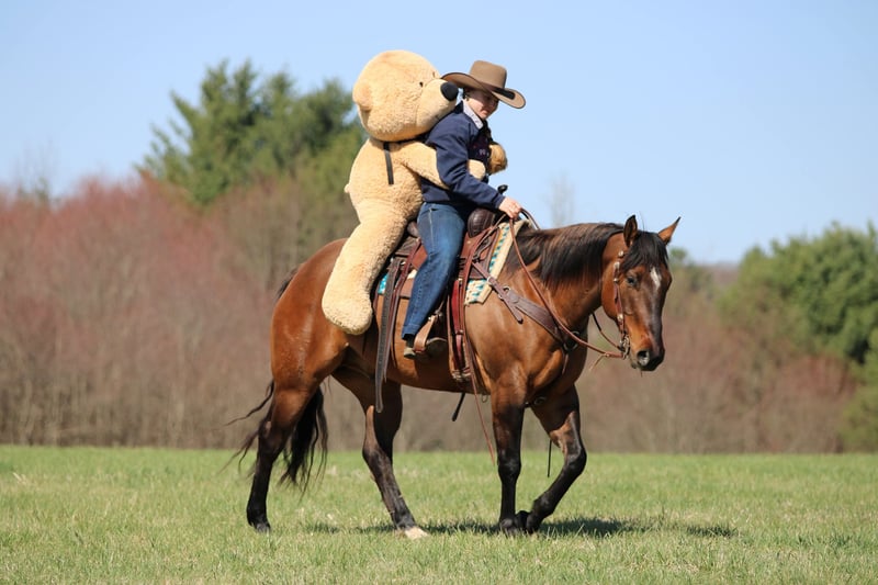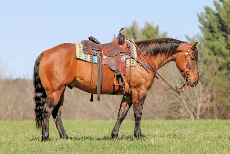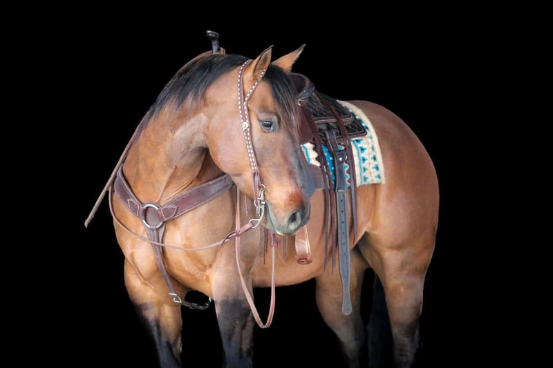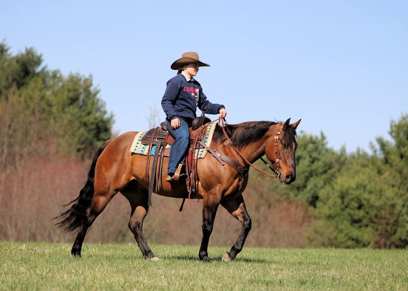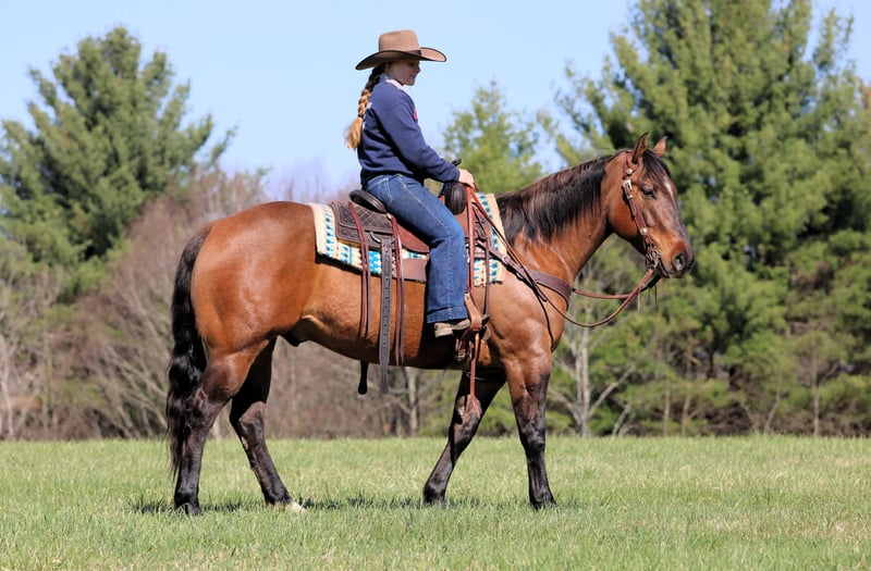 Espresso, potro de 7 años, de 15 manos, de color dun en tono buckskin, de raza Quarter Horse y con o