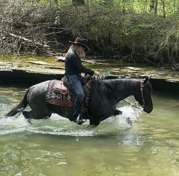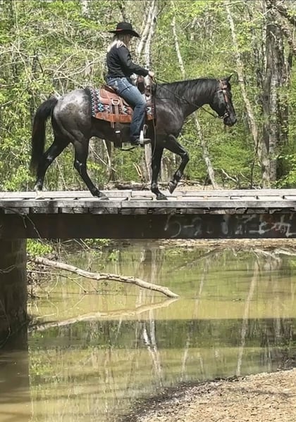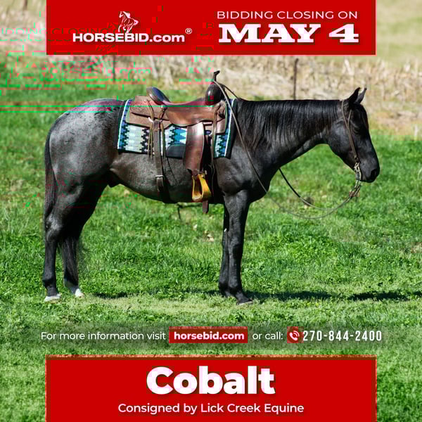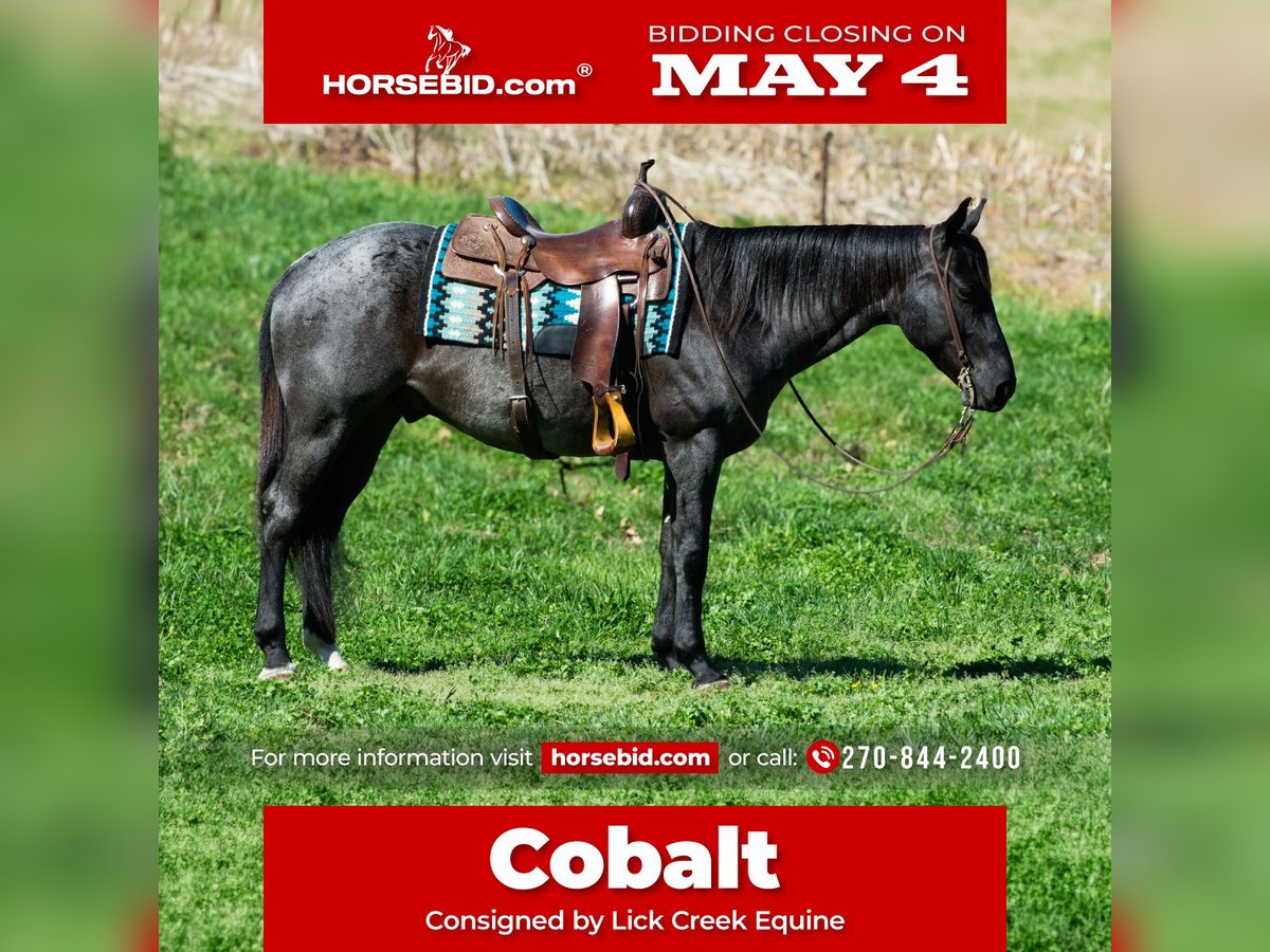 ▪️▫️◾️𝐭𝐡𝐞 𝑴𝒂𝒚 𝐒𝐞𝐥𝐞𝐜𝐭◾️▫️▪️ Happening now thru MONDAY | MAY 4th - Available EXCLUSIVELY on HorseBid's website! For more details and to register visit: www.Horsebid.com CONSIGNOR CONTACT: Lick Creek Equine 270-844-2400 LOCATION: Henderson, KY BREED: Quarter Horse REGISTERED: No REGISTERED NAME: Cobalt COLOR: Blue Roan HEIGHT: 15 AGE: 7 GENDER: Gelding Cobalt is a 7-year-old 15hh thick made true blue roan gelding. He has a very sweet personality and will meet you in the pasture or gate to get the attention. Cobalt is a great trail horse. He is one that doesn’t care if he’s in the front, middle, or back of the pack. Cobalt will cross water, cross logs, go through mud, rough terrain, over bridges and is traffic safe. We have taken Cobalt on multiple trail rides, and you couldn't ask for a safer horse. He will ride out alone and away from the barn and be dependable. Not only is he great out on the trail, but Cobalt has also been used in the pastures to gather and sort cattle. He’s roped cattle on a ranch and dragged them to the branding pits and doctored cattle. Cobalt will neck rein or you can ride him two handed. He will walk, trot, and canter when asked. He takes both leads and has a smooth lope. Cobalt makes mounting simple as he will stand at a mounting block for you to get on and will stand until asked to move. Cobalt is currently shod all the way around. He stands great for the farrier, baths, tacking/untacking, and mounting. Cobalt does great in the pasture with other horses. He does great in a stall as well and has great stall manners. He loads in and out of the trailer easily. If you are looking for a lifetime partner to add to your family look no further. Cobalt will take care of the whole family. Whether it be on the trails, in the arena or on the ranch. He has a very calm demeanor and loving attitude. Most importantly he is as dependable as any. We invite anyone and everyone to come meet and ride Cobalt at our barn in Henderson, Kentucky. We are happy to assist with transportation arrangements. For any questions about Cobalt please contact Tasha 270-844-2400