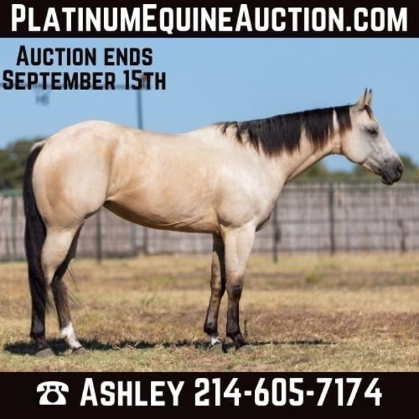 ONLINE AUCTION Place your bids at www.PlatinumEquineAuction.com Starting Bid $3500 Auction ends September 15th, 2024 Need a new saddle? Check out White Rock Saddles on our website or Facebook! Doc Tiny Dancer – 15.1H, 2019′ buckskin AQHA mare. Tiny Dancer is an absolutely stunning creamy colored buckskin mare that has an easy, uncomplicated handle – that is easy for just about anyone to ride! Dancer has TONS of outside miles on her checking cattle and watching fences. She has a big marching walk that will keep on with just about anyone, she travels out with her head down and relaxed on a big long drapey rein. Dancer has an excellent handle and side-passes easily, guides around anywhere you want her to one-handed, has a great turn around, good stop on “whoa”, and she naturally trots and lopes around relaxed and level headed. Dancer is friendly and easy to catch, stands tied quietly, is gentle and easy to groom, pick feet, bathe, saddle, bridle, and stands dead still for mount and dismount. She has been hauled frequently and she hops right on the trail, self loads, and hauls quietly alone or with other horses. She has been ridden out many miles alone and also rides well in a group of horses. This mare has her whole life ahead of her and will make a great addition to any family. She would be great for a kiddo to do 4H on, to play around at the local ranch shows, use of the ranch, or go to the local barrel races, ropings, or playdays – this mare is athletic and versatile while still being a pretty mover and would be good a variety of jobs! Tiny Dancer was just shod this past week, her teeth will be being done by an equine dentist next week, her ears were just preemptively treated for ticks, and she was also power packed wormed. She is good to shoe, has great feet and also goes well barefoot – if her new owner prefers her to be barefoot, we can have her shoes pulled and trim her prior to her heading to her new home. She will arrive at her new home up-to-date and ready to go to work! We are experienced, knowledgeable sellers, and we can help with quickly arranging affordable shipping to any buyer’s location – we have experience shipping worldwide – including regularly to Hawaii, Canada, Mexico, Europe, and South Africa. Please check our website for buyer reviews, additional videos, pics, info, etc: https://busterhorses.com/Doc-Tiny-Dancer We are located in Weatherford, TX. Contact Buster Horses Ashley 214-605-7174 with any questions. ONLINE AUCTION Place your bids at www.PlatinumEquineAuction.com Starting Bid $3500 Auction ends September 15th, 2024 Need a new saddle? Check out White Rock Saddles on our website or Facebook!