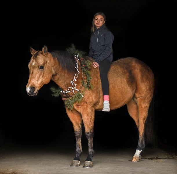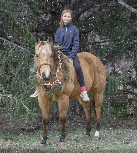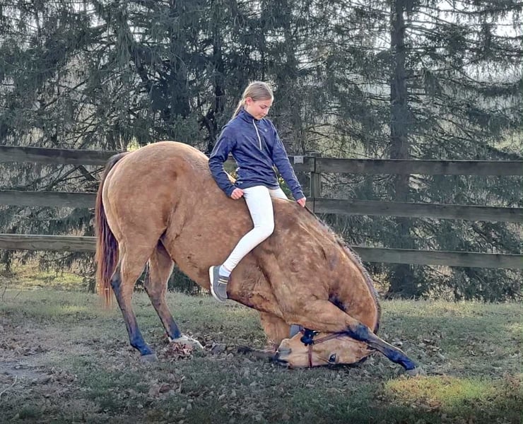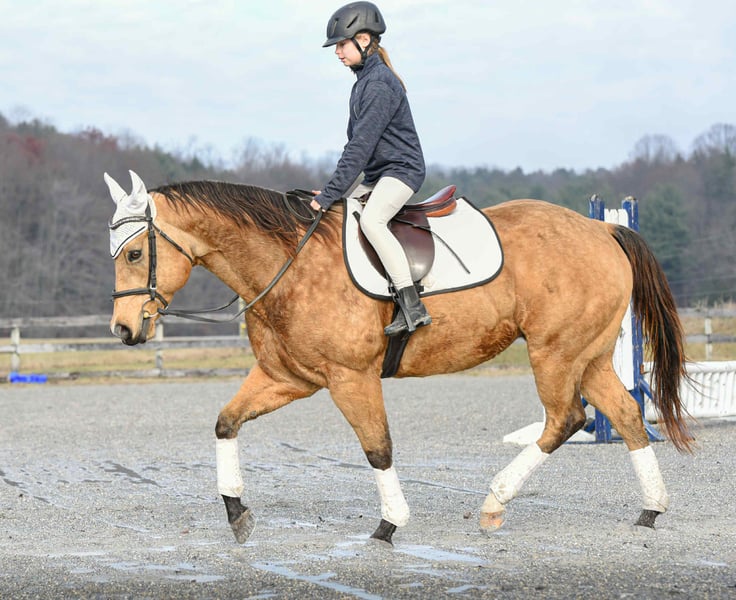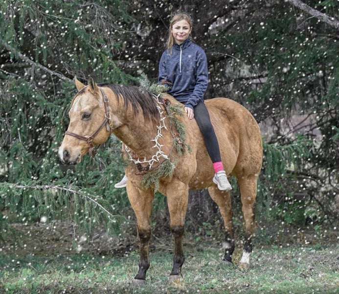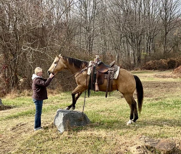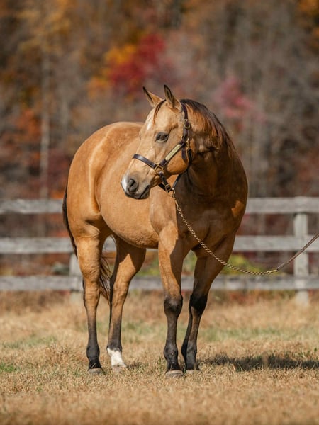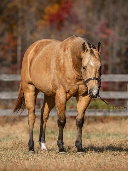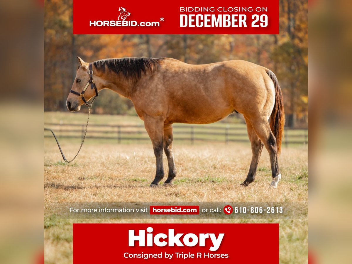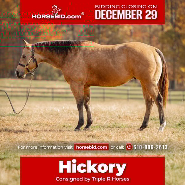 ⚜️ 𝓗𝓮𝓻𝓲𝓽𝓪𝓰𝓮 𝐖𝐢𝐧𝐭𝐞𝐫 𝓒𝓵𝓪𝓼𝓼𝓲𝓬⚜️ Happening now thru MONDAY | DECEMBER 29th - Available EXCLUSIVELY on HorseBid's website! For more details and to register visit: www.Horsebid.com CONSIGNOR CONTACT: Triple R Horses 610-806-2613 LOCATION: New Holland, PA BREED: AQHA REGISTERED: Yes REGISTERED NAME: Skip’s Auburn COLOR: Buckskin HEIGHT: 15.1 AGE: 6 GENDER: Gelding “Skips Auburn” aka “Hickory” is a 6yr old, 15.1hh, AQHA gelding, with a beautiful dappled buckskin coat. This boy is a total puppy dog, fall asleep in your arms, melt your heart type of dude. He is incredibly sweet, kind, safe, and honest. He is safe for anyone on the trails, and can make anyone look good in the ring! Hickory is very versatile, and the ultimate trail partner! Hickory is a teachers pet, who thrives on pleasing his rider, and taking good care of them. In the barn, Hickory has zero bad habits. He is a gem in his stall; and so quiet that you could forget that he is even there. He will hang his head out and ask for love, then proceed to fall asleep in your arms. He is a total lover and adores attention. He can live in or out, causes absolutely zero drama with his herd, and will drop what he is doing to greet you at the fence, or in the pasture. I think he likes humans more than horses. Hickory has incredible ground manners, and he is safe for kids and beginners to work with. He stands on the cross ties or straight tied to be groomed, tacked, bathed, etc. He is good for the farrier and vet. Hickory is an amazing trail partner. Any level rider can enjoy him and have fun adventures with him. He is safe and gentle, goes alone and with a group, will lead or follow. Hickory will be the first one through scary obstacles such as rushing water, high bridges, narrow pathways, you name it. He is not spooky and safe with traffic, bikes, dogs, wildlife and more. This boy is extremely sure footed, I have never ridden a horse that will actually lower his head to watch the ground in tricky areas. You can drop your reins down steep hills and trust that he will sit back, and use his brain to get down safely. He will maneuver through rocks, over logs, and will plop into the water any chance he gets. He loves to play in the lake, and never says no. I have asked Hickory to do some sketchy stuff and he has never argued, he just says yes ma’am and gives you his all. He packed a child around on a long trail ride, through water, over bridges, and never made a wrong step. He stood tied to a tree, with a horse tied to him, as we sat down and ate lunch. I have also trail ridden him with no bridle, just a neck rope!!!!! If you want to show off to your friends, or just feel safe, this is the boy for you!!!!! Hickory is the same horse every ride, whether he sits for weeks or not, tack up and go out with confidence. He steps off of the trailer in new places as if he’s lived there all along. Load him up all by himself and take him out riding, he does not holler for friends or act any differently when alone. He loads and trailers well, and will back off of a trailer or turn around to get off. Hickory rides western, english and bareback. His gaits are extremely smooth and comfortable. He has smooth transitions and listens to voice commands as well. Hickory will walk, jog, trot, canter, knows his leads and is started on a lead change. He moves off of leg very nicely, and he is nice and soft. Ask him to ride collected or ride on the buckle. He neck reins, pivots, side passes, started on a half pass, ask for a big stop or bring him down easily through the gaits, backs up, bends off of your leg, and over all is a blast to ride. His gaits are very adjustable. He toted around a beginner kid for a little lesson, and is just such an honest dude. Hickory has been lightly started over cross rails as well! Hickory has also sorted cows, and has done a little bit of other fun ranch things. Whether you are looking for a trusty trail buddy, or to compete, Hickory has the potential to do it all! He is currently set up to head in any direction. I truly adore this horse, and I really wish I had the room to keep them all. Hickory is as easy keeper with no maintenance. He is hypp n/h, with no symptoms or issues. I feed him triple crown low starch as a precaution, but he is asymptomatic. He has no health or soundness issues. Hickory never asks for anything other than to be your best friend. One rainy and cold day, I decided that I was going to play around with teaching Hickory to bow, and he learned in five short minutes!!!!! He is incredibly smart and teachable!!! Here is a beautiful gelding with a heart of gold, and everything to offer. Don’t miss the opportunity to make this special horse yours!!! Hickory is up to date, and shipping can be arranged anywhere! Please don’t hesitate to reach out for further information!