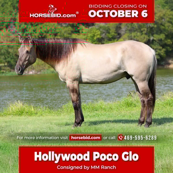 🍂 𝓐𝓾𝓽𝓾𝓶𝓷 𝑨𝑳𝑳 𝑺𝑻𝑨𝑹 𝑳𝑰𝑵𝑬𝑼𝑷 🍂 Happening now thru MONDAY | OCTOBER 6th - Available EXCLUSIVELY on HorseBid's website! For more details and to register visit: www.Horsebid.com CONSIGNOR CONTACT: MM Ranch 469-595-6289 LOCATION: Forney, TX BREED: Quarter Horse REGISTERED: Yes REGISTERED NAME: Hollywood Poco Glo COLOR: Grullo HEIGHT: 15.1 AGE: 6 GENDER: Gelding 🌟AQHA register grullo gelding!!! 🌟Yes a registered grullo gelding!!! He’s got that old fashion color everyone wants. And ONLY 6 years old!! Meet “Hollywood Poco Glo” his barn name is Woody. This is absolutely the barn favorite around here. He is 15.1 hands tall. You don’t see them like this everyday. 👉🏼 You can catch Woody in 100,000 acre pasture. He will walk right up to you. This is a kind very willing to please type. He will do anything you ask him to do. He has been used on the ranch to check cattle and fences. He crosses water, bridges, can ride him in any type of terrain. He will go out alone on trails too. Absolutely nothing brothers this horse. He is as laid back as they come. The best part is he is only 6 years old. He has the potential and ability to go on to do anything you want him to do. And he is super quiet and gentle. 💥💥Absolutely no buck or bad habits. ⚡️He sells 100% safe and sound in every way. We can help with making shipping arrangements. New coggins and health certificate will be included.
