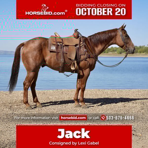 ♦️ 𝐭𝐡𝐞 𝐀𝐌𝐄𝐑𝐈𝐂𝐀𝐍 𝓕𝓪𝓵𝓵 𝓒𝓵𝓪𝓼𝓼𝓲𝓬 ♦️ Happening now thru MONDAY | OCTOBER 20th - Available EXCLUSIVELY on HorseBid's website! For more details and to register visit: www.Horsebid.com CONSIGNOR CONTACT: Lexi Gabel (503) 676-4666 LOCATION: Stickney BREED: AQHA REGISTERED: Yes REGISTERED NAME: Jack red Watch COLOR: Red roan HEIGHT: 15.1 AGE: 6 GENDER: Gelding Jack is a 6 yr old AQHA Red Roan Gelding. He is 15.1 hands tall. He is very gentle, he's been on miles of trail riding. He has been rode lots of trails in Nebraska and Colorado. You can swing a rope off of him, started on hot heels, really athletic and wants to learn, would make an excellent head horse, but gentle anyone can get along with him. A super cool young gelding that can do it all. Call or text (503) 676-4666