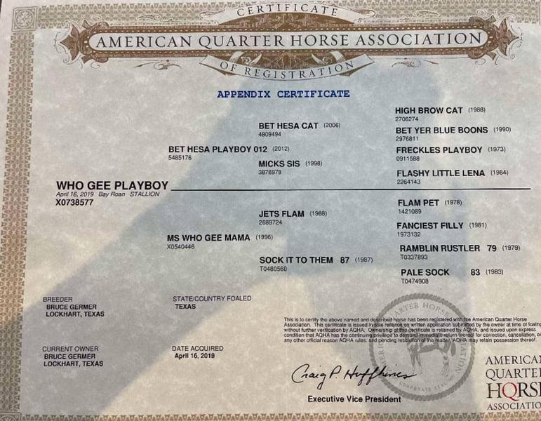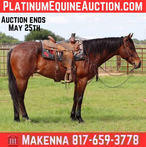 NLINE AUCTION Place your bids at www.PlatinumEquineAuction.com Starting Bid $3500 Auction ends May 25th, 2025 Need a new saddle? Check out White Rock Saddles on our website or Facebook! Meet WHO GEE PLAYBOY…. THE ULTIMATE ALL AROUND PROSPECT YOU’VE BEEN LOOKING FOR! Started Head Horse Established Ranch Horse Ranch Rodeo Horse Fun Trail Horse ♾️2019 model AQHA bay roan Gelding♾️ ♾️15.2 hands tall, weighs 1200lbs♾️ The first thing people notice about Playboy is that he’s simply gorgeous. He is shapey with a big soft kind eye and he has a cool ranchy look about him that always gets attention. He’s also a perfect size, easy to mount with great substance and presence. We have started Playboy on the smarty and slow steers in the arena, but a great horse to go rope and doctor one outside! He has a promising future in the roping pen. Playboy is a fun one to take down the trail, don’t let his age fool you, he is as chill as they get! He crosses through anything, traffic safe and will go all day! This guy is cool as a cucumber, not much of anything bothers him. Really nice, young gelding ready for his person! You are more than welcome to come out and see him, we are located in Lipan Texas. If you are not able to see him in person, we offer FaceTime showings as well and can help arrange hauling anywhere in the US, Hawaii or Canada! Please call or text Makenna Hartzell 817-659-3778 for more information about our outstanding gelding! ONLINE AUCTION Place your bids at www.PlatinumEquineAuction.com Starting Bid $3500 Auction ends May 25th, 2025 Need a new saddle? Check out White Rock Saddles on our website or Facebook!
