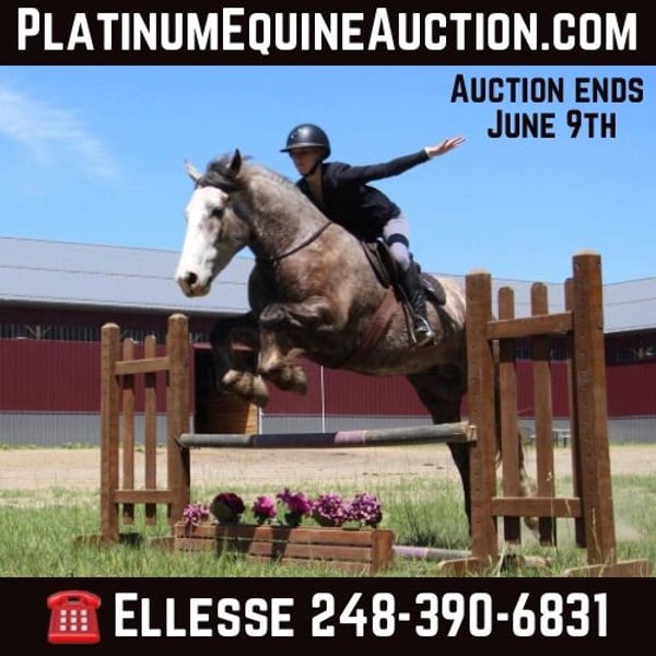 ONLINE AUCTION Place your bids at www.PlatinumEquineAuction.com Starting Bid $3500 Auction ends June 9th, 2024 Need a new saddle? Check out White Rock Saddles on our website or Facebook! “Cinnamon Twist” or Cinnamon as we call him is nothing short of spectacular. From his mind to his color there’s nothing he’s lacking. Cinnamon is a 15.3hh stout made Drum horse (Gypsy Vanner Percheron cross) dappled grey gelding. He is 5 years old. Cinnamon has an incredible mane and tail and light feathering. He has gorgeous conformation and his dapples have dapples. Not only is he stunning, he is sensible. Cinnamon will walk, trot, and canter with ease. All of his gaits are as comfortable as floating on a cloud. He has had years of natural horsemanship training and will ride completely tackless at the walk, trot, canter and even over jumps. He moves off of your seat and leg effortlessly. He has been in the city, in traffic, in the woods and in water. He has been in the arena and the fields. This guy will go anywhere with any rider onboard. He goes English, Western, and even bare back. He knows how to drive and loves it. Cinnamon has all the bells and whistles when it comes to his trick training. He will sit, lay down, and bow with a simple tap on his chest or ankle. He has seen tarps, umbrellas, yoga balls, bridges, inflatable dinosaurs, and much more. You will be hard pressed to spook him. This gelding has been on several hunter paces. He has also been used to round cattle. He jumps in beautiful form. He has been to schooling shows and used in lessons for kids as young as 5 years old. This is a unique find that would be an asset to anyone looking for a feathered horse that anyone can get along with anyone in any situation. Please call or text Ellesse Schwartz at 248-390-6831. Cinnamon lives in Howell, MI 48855. ONLINE AUCTION Place your bids at www.PlatinumEquineAuction.com Starting Bid $3500 Auction ends June 9th, 2024 Need a new saddle? Check out White Rock Saddles on our website or Facebook!