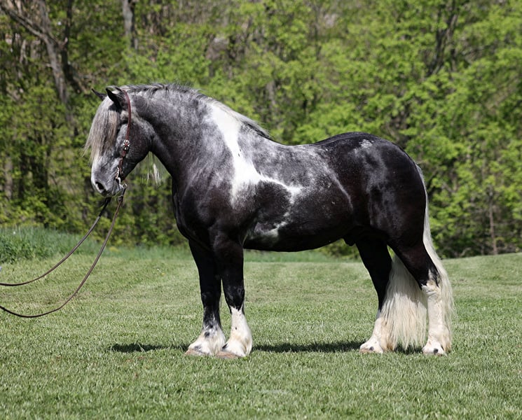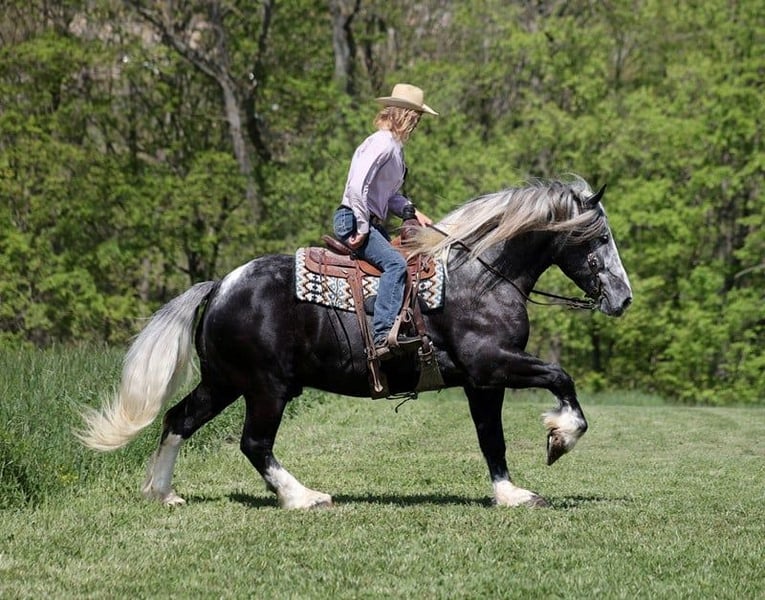 Consigned to Cowgirl Cadillacs in Sheridan, WY. Sales June 14-15th. You can bid online, phone bid or bid in person! With movie star good looks, muscles upon muscles and that long flowing hair you’d expect to see Slate on a Hollywood movie screen. Slate a stout built, 16H, 6 year old, grey tobiano draft-cross (paint/ quarter horse/ percheron) gelding that stands 16H tall. He is trained to lay down and sit, on command. Slate is everyone’s best friend and he loves attention. He has been used around the ranch and can pull anything that you can throw a loop on. If a mad momma cows pushs on him, he will just stay calm and push right back. The kids have ridden him around the ranch and checked cattle on him. He has seen the bright lights, heard the loud speakers and the roar of the crowd at the rodeo while shagging bulls from the arena. He has also been drove down the highways under harness and is traffic safe. Slate has a smooth jog, takes his leads and will lope as soft and slow as horses half his size! He has a good stop, sidepasses to open/shut gates and backs with ease. Slate has been exposed to all kinds of wildlife, he has been used in the mountains for hunting and has packed game. Slate is great on the trails, he picks his way through rocky terrain, crosses deep water, scales slopes with ease and walks across deadfall as well. If you need to feel safe and secure just hop on Slate and enjoy the ride, you will soon see that there is a lot more to this guy that what meets the eye! Call 606-308-2461 for more info.