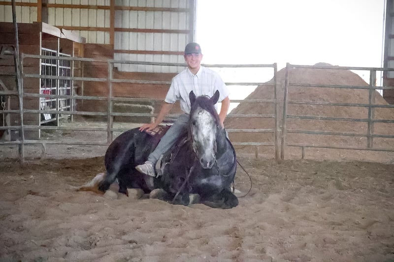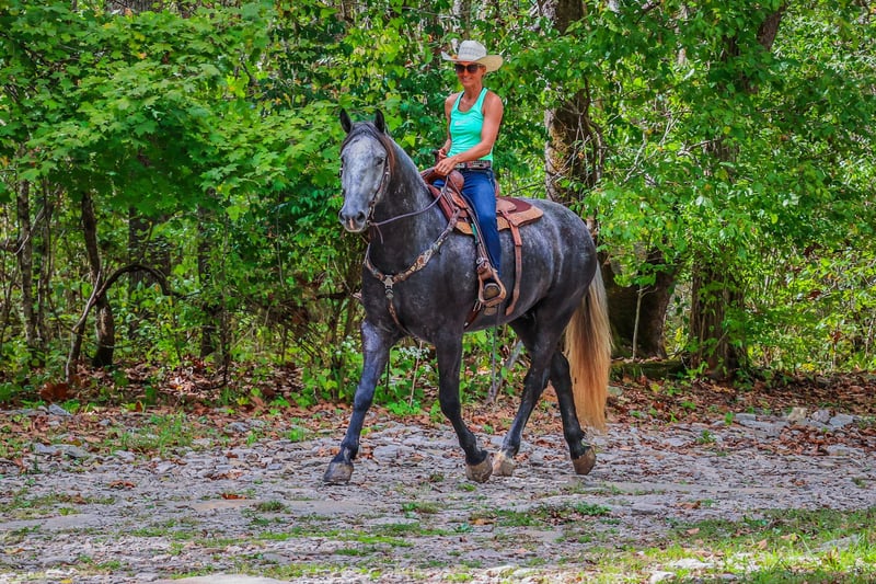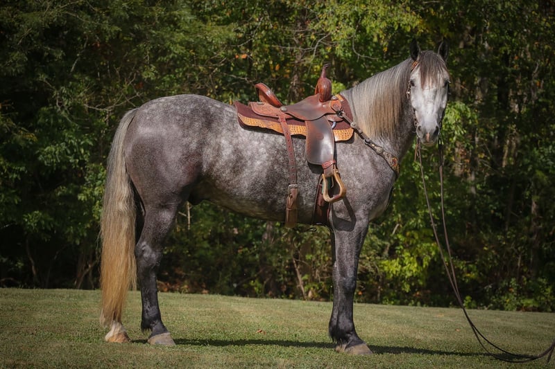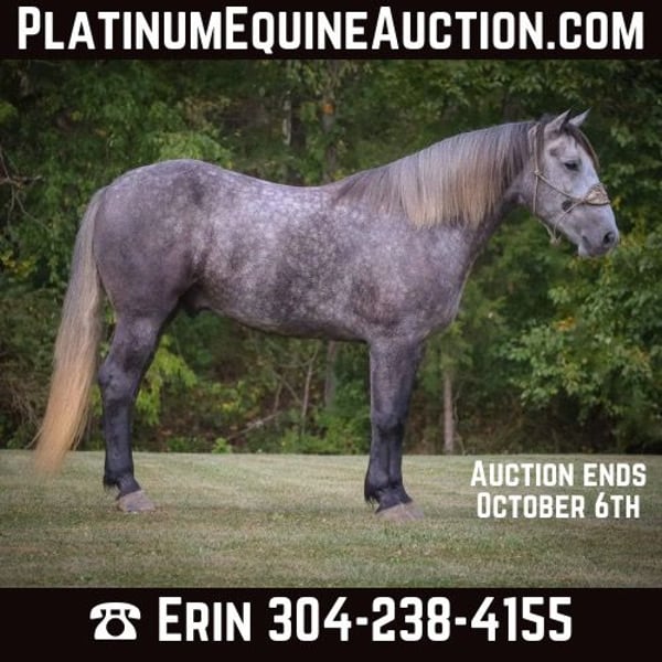 ONLINE AUCTION Place your bids at www.PlatinumEquineAuction.com Starting Bid $3500 Auction ends October 6th, 2024 Need a new saddle? Check out White Rock Saddles on our website or Facebook! This is “Austin”, A GREAT MINDED, PROFESSIONALLY TRAINED, and GENTLE DAPPLE GRAY PERCHERON QUARTER HORSE CROSSBRED GELDING. This gelding is broke to ride and drive. He stands 16.3 hands tall and is 5 years old. This gelding is a gorgeous steel gray with big dapples all over him. He has been used for ranch work and is handy, athletic, responsive, and obedient. He will sit down and turn around, stop easily on whoa, back up for ANY distance, and he moves off of leg and seat cues. This gelding stands to harness, hitch, tack, mount, and groom. He has excellent ground manners, he is not spooky, and he is traffic safe. He will lope and jog nice circles, he catches his leads, and will one step lope. He rides and drives collected, calm, and cool. He has been on cross country wagon rides and will go through the deep water quietly and he will go up and down the steep hills relaxed. He won’t go any faster than you ask of him and he is not chargy. He is patient, kind, and willing. He will ride out alone with no problems and also rides in a large group. He has been on camping trips at state parks and will stand tied overnight. He is everything you want all in one package. He has the size, the build, the look, the color, the brains, the ability, the training, and the attitude that will make you happy. He is good with all other horses and unloads in new surroundings quietly. He is fun to ride, easy to drive, and has a head full of sense. Located in Flemingsburg, KY. Contact HH Horses Erin 304-238-4155. ONLINE AUCTION Place your bids at www.PlatinumEquineAuction.com Starting Bid $3500 Auction ends October 6th, 2024 Need a new saddle? Check out White Rock Saddles on our website or Facebook!