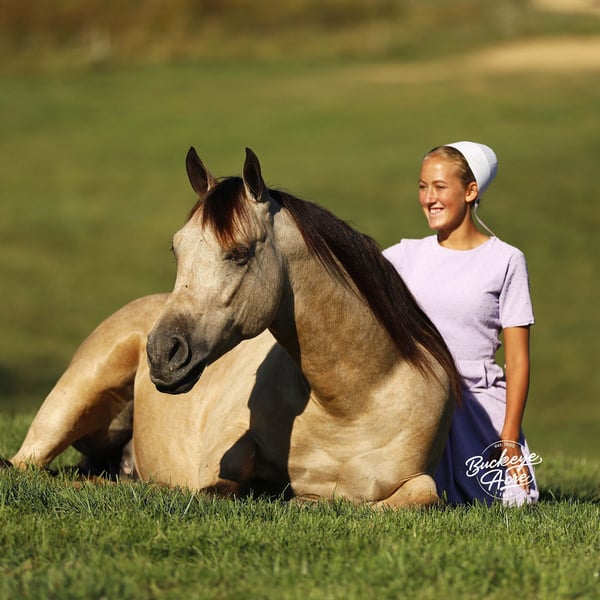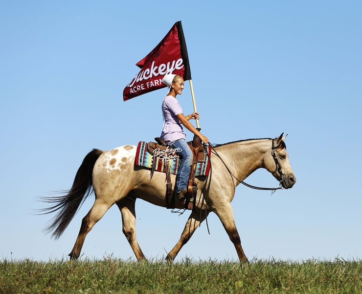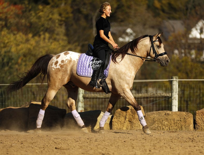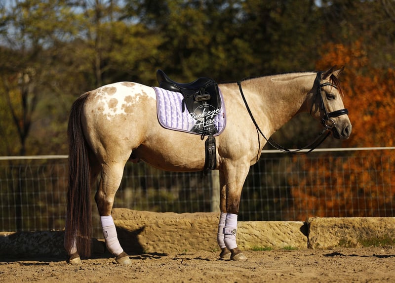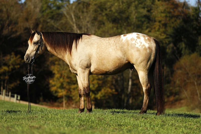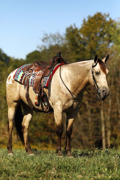 Wow, wow — where can you find a horse like Loyal? This handsome 2019 Quarter Horse cross stands 15.1 hands tall and has one of the most unique color combinations you will ever see. He is a golden buckskin with soft Appaloosa dapples across his hips, four jet-black socks, and a long black mane and tail that shimmer in the sun. His color alone will make you stop and stare, but it is his gentle personality that truly sets him apart. Loyal has been almost everywhere you can think of. He has been down long country trails, across open fields, through creeks and rivers, and up and down steep hills. He has crossed logs, bridges, and ditches without hesitation. He has also been down busy state roads and through town, taking cars, trucks, and traffic noise all in stride. Loyal has been used to check cows and fence lines, and he enjoys having a job to do. He is steady-minded and sure-footed, never in a hurry, but always willing. This gelding has been desensitized to about everything, tarps, jugs, gunfire, whips—and he has even carried the flag. He is confident wherever you take him, whether it is a quiet solo trail ride or a busy group outing. Loyal has also spent plenty of time in both the indoor and outdoor arenas. He knows his leads, moves off leg pressure, and will side-pass right up to the mounting block for you with just a lift of your arm. He rides soft in the bridle, has nice transitions, and listens closely to his rider. Loyal’s movement is as smooth as it gets. His walk is relaxed, his jog is steady and comfortable, and his extended trot covers ground beautifully. His lope is easy to sit in and rhythmic enough to ride all day long. Whether you are a weekend trail rider or someone looking for a versatile all-around partner, Loyal fits the bill. He is the same dependable horse every time you saddle him up. Ride him once a week or once a month, he stays consistent, kind, and ready to go. Loyal has the type of disposition that makes him suitable for anyone, from kids learning to ride to senior riders who want something safe and enjoyable. He is patient, forgiving, and always tries to please his rider. Loyal is up to date on all his vaccinations, shoeing, and deworming, and he is sound and healthy in every way. He is the kind of horse that makes you proud to own him—not just because of his striking looks, but because of his willing heart and steady nature. From the arena to the trails, from parades to pastures, Loyal is a horse you can count on to make every ride a good one. Every time you see him standing there with that golden coat and kind eyes, you will find yourself smiling. Loyal is not just another pretty face, he is a trustworthy, honest partner ready to take care of his next rider, wherever the trail leads. If this sounds like the horse that you have been looking for, please feel free to reach out to Duane @ 330-231-2324 for more information or to stop by and see him in person.