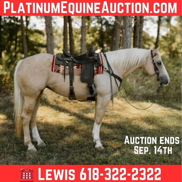 ONLINE AUCTION Place your bids at www.PlatinumEquineAuction.com Starting Bid $3500 Auction ends September 14th, 2025 Need a new saddle? Check out White Rock Saddles on our website or Facebook Sugar is a well-built, attractive 2019 model reg AQHA palomino mare standing around 15.1 hands and she is well built. She is an eye-catching individual with a willing disposition and the ability to go in any direction. She has extensive trail experience, confidently crossing creeks, logs, and varied terrain. Sugar will carry a flag, open/shut gates, and handle obstacles with ease. She has also been around cattle and shows a natural interest, making her a solid prospect for ranch work or arena events. With her good looks, athletic build, and versatile foundation, Sugar is the kind of mare that will stand out wherever she goes. For more info contact Lewis Weaver 618-322-2322 with any questions. Located in Salem, IL. ONLINE AUCTION Place your bids at www.PlatinumEquineAuction.com Starting Bid $3500 Auction ends September 14th, 2025 Need a new saddle? Check out White Rock Saddles on our website or Facebook