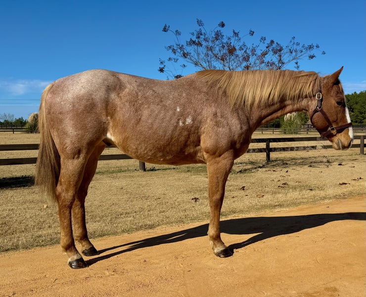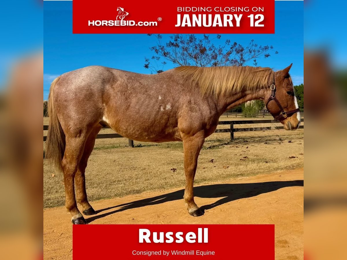 ♦️𝐍𝐄𝐖 𝐘𝐄𝐀𝐑'𝐒 𝑬𝒙𝒕𝒓𝒂𝒗𝒂𝒈𝒂𝒏𝒛𝒂♦️ Happening now thru MONDAY | JANUARY 12th - Available EXCLUSIVELY on HorseBid's website! For more details and to register visit: www.Horsebid.com CONSIGNOR CONTACT: Windmill Equine 860-250-9120 LOCATION: Johnston, SC BREED: QH REGISTERED: No COLOR: Red Roan HEIGHT: 15.2 AGE: 7 GENDER: Gelding Russell is a 7yo 15.2h QH gelding. This guy is so much fun. In the barn he is kind and easy. He is great in group turnout and is easy to catch. Under saddle this guy has a lot of miles in a variety of jobs but nothing overly formal. He rides English and Western, bareback too. He is light in the bridle with a good headset and an easy whoa. He has three comfortable and balanced gaits that are also very adjustable. He jumps a small course of fences and his changes have been started. Out of the ring this guy is brave, willing and honest. He has seen many miles through the trails, down the road and even up in the mountains. He is traffic and dog safe and will ride out alone or with company. He goes anywhere he is asked and will ride though the toughest terrain and go over, under or through anything. One of his favorite things is going trail blazing. He truly will go absolutely anywhere you point him. He has worked the ranch, seen the cows and had a rope thrown off of him. He is not phased by a busy day on the ranch. He has also gone out to track cows, catch strays and check fences. This guy is the type to be your absolute best friend in life. He aims to please and is really a smart boy. He loves having a job, but he loves his person more. He just wants to keep you happy. He is barefoot with no vices or maintenance. This guy is ready for his person, family or program. He is ready to be finished with one job or continue as a jack of all trades. No matter what, he will always be your best friend.