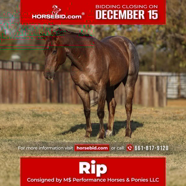 🎄𝐓𝐇𝐄 𝑯𝒐𝒍𝒊𝒅𝒂𝒚 𝐂𝐋𝐀𝐒𝐒𝐈𝐂🎄 Happening now thru MONDAY | DECEMBER 15th - Available EXCLUSIVELY on HorseBid's website! For more details and to register visit: www.Horsebid.com CONSIGNOR CONTACT: M$ Performance Horses & Ponies LLC 661-817-9120 LOCATION: Stephenville,TX BREED: Quarter Horse REGISTERED: No COLOR: Red Roan HEIGHT: 15 AGE: 6 GENDER: Gelding Meet Rip — a 6-year-old, stunning red roan gelding standing a solid 15.0 hands. He’s the kind you can saddle, step on, and go to work or enjoy your day. Rip is sweet, honest, and dependable, with that rare “yes sir/yes ma’am” mindset that makes him a true partner. Rip has seen the real world. He’s put in many outside miles, been penning back cattle at the sale barn, and has checked fence and pasture like a seasoned hand. He’s been to town and walked right down Main Street, traffic, Christmas lights, and all—never missing a beat. Point him where you want to go and he’ll follow through, calm and confident. On the trail, Rip is sure-footed and steady. He handles varied terrain with ease, crosses water, logs, and bridges, and has even dabbled in trail obstacles, taking everything with a willing attitude. In the arena, he’ll walk, trot, and lope circles, making him a great candidate for someone wanting a versatile ranch, trail, or family horse with potential to go any direction. Rip is as easy to keep as he is to ride. He stalls well, is good in a herd, stands tied, good for the farrier, and hauls like a gentleman. He’s the kind you enjoy every day and trust with your adventures. If you’re looking for a genuine gelding with heart, brains, and beauty, Rip is ready to step into your barn and be your go-to horse. Let him be the one to take you further. We are open to anyone interested in him to schedule a time to come see him or if you can’t make it schedule a FaceTime showing to see him. If you need help with transport don’t hesitate to ask we have a list of reputable haulers that can get him safely to your doorstep WORLD WIDE including, Alaska , Mexico, Hawaii, Canada and anywhere in between.
