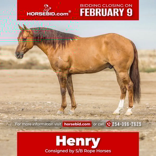 ❤️🔥𝑩𝒆 𝑴𝒊𝒏𝒆 𝐒𝐄𝐋𝐄𝐂𝐓❤️🔥 Happening now thru MONDAY | FEBRUARY 9th - Available EXCLUSIVELY on HorseBid's website! For more details and to register visit: www.Horsebid.com CONSIGNOR CONTACT: S/B Rope Horses 254-396-2625 LOCATION: Wickenburg, AZ BREED: QH REGISTERED: Yes REGISTERED NAME: Hoofin Drifter COLOR: Dun HEIGHT: 14.3 AGE: 8 GENDER: Gelding Henry Soft, kind, and dog-gentle — truly one for the whole family. Henry is an 8-year-old Driftwood-bred gelding standing 14.3 hands and cute as a button. He is as solid as they come on both ends: head, heel, and playdays. This is the horse you can jackpot on in the morning and then turn around and let your 6-year-old take to the youth roping that evening. That gentle. That honest. That trustworthy. Henry is a superstar in and out of the arena. He scores great, has plenty of run, and stays user-friendly no matter the setup. Short-strided with quick feet, lots of cow, and he tries hard every single time. He loves the branding pen, he loves the trail, and he loves having a job. If you’re looking for one that can take you to the pay window AND still be a true family horse — Henry is your guy. Located in Wickenburg, Az