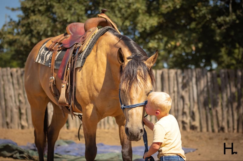 ONLINE AUCTION Place your bids at www.PlatinumEquineAuction.com Starting Bid $3500 Auction ends September 15th, 2024 Need a new saddle? Check out White Rock Saddles on our website or Facebook! Cartels Gunsmoke is a 6yr old, 14.3hh, AQHA registered gelding, “Kodak”, as he is affectionately known, is our little golden boy. Everywhere he’s gone he’s gotten compliments, not only his looks but his demeanor as well, and no matter the job you task him with he’s going to try his hardest to do and be the best; whether that’s doing work from sun up to sun down on the ranch, hitting the show pen in ranch versatility classes, packing toddler and youth riders around, or going for a trail ride. Kodak is no stranger to a hard days work and has been used in all aspects of ranch work. Most recent on his ranching resume, he was the main mount used on a 70,000 acre ranch in New Mexico where he gathered, sorted, doctored, branded, and loaded trucks. Where he was at in New Mexico is considered the high desert. If you’re unfamiliar with what the high desert entails, it is a vast and rocky environment which helped contribute to Kodak’s sure footedness. He will go all day for ranch work and has an extremely comfortable trot to set out at to check fence. Besides being used for ranch work outside, Kodak also has experience exploring state parks and trails where he will walk out on a loose rein alone or in a group and is a happy camper no matter how long or short of a trail ride you’d like to have. In the arena, Kodak is also a joy to ride. He’s smooth and fluid in all gaits and transitions and stays soft and supple in your hand. He has an easy turn around, can pick up both his leads from a walk, and will come right down to a slower gait or stop by a simple lift of your hand and some seat pressure. He’s easy to get along with in the saddle, has packed around inexperienced kids including our 3yr old son whom Kodak has been helping teach how to ride, and is a happy medium between “whoa” and “go” as he’ll go the pace that’s asked of him. Recently Kodak has dived into the show world of ranch versatility and has shown he has real potential to be a star in it with a few more shows under his belt. He does all maneuvers needed for trail (opening/closing gates, dragging logs, bridges, backing Ls, log jumps, water crossings, etc.), is pleasant in a cramped rail class, has a beautiful extended trot for your pleasure and ranch riding classes, has a solid foundation laid for the reining, and has a ton of natural cow sense for your cow work classes. He won’t be your open division winner, but Kodak is absolutely a mount a Non-Pro/Amateur/Youth could enjoy, show, and be successful with. On the ground, Kodak is as pleasant as a horse could get. He stands for absolutely everything like a gentleman, loves being doted on, is easy to catch, gets a long with others in a herd well, stalls with no issues, and is gentle enough that I have no second thoughts when it comes to my 3yr old son playing around Kodak or handling Kodak by himself. Kodak is UTD on all care from teeth to vet work and has a recent health exam on file including x-rays of his front feet and hocks with no remarkable findings. He requires no maintenance and has no bad habits or vices. Kodak has a personality as golden as the color of his coat and we absolutely love and adore him in every way. Being as phenomenal as he is at just 6yrs of age, the sky truly is the limit when it comes to the possibilities with this gelding. Whether you want a solid horse to use on your ranch, your next up and coming show horse, or a horse that the whole family can enjoy… Kodak can fill the position! H Spur Performance & Versatility Horses invites you to come meet Kodak in Weatherford, Tx and we can help assist setting up hauling nationwide. For any questions or to talk about if Kodak is the right fit for you, please contact Sarah at 817-366-6123. To watch all of Kodiak’s available videos in their entirety as well as view his health exam and additional pictures, please visit www.hspurhorses.com/cartelsgunsmoke ONLINE AUCTION Place your bids at www.PlatinumEquineAuction.com Starting Bid $3500 Auction ends September 15th, 2024 Need a new saddle? Check out White Rock Saddles on our website or Facebook!