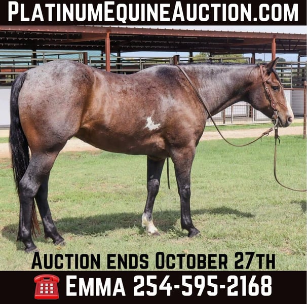 NLINE AUCTION Place your bids at www.PlatinumEquineAuction.com Starting Bid $3500 Auction ends October 27th, 2024 Need a new saddle? Check out White Rock Saddles on our website or Facebook! – a breath taking 2018 GRADE bay roan gelding. Trump stands 14.3 hands, is the definition of the American Ranch Horse- Raw boned, big brown eyed, bay roan, thick tailed, cowy, pleasure horse. Trump has been on a working ranch since day one! Trump is no stranger to long hours, rough country, and wild cattle. He is a what we like to call “handy”. He has a solid neck rein, travels correct, and always aims to please. Trump has been used in the sale barn aspect as well, where he is used to sort and load thousands of head every week. This stout boy has a vividly attractive stride and carries himself with ease. Trump has a big beautiful cross over in his turn arounds, packs his face pretty in his circles, and will get in the ground. He has never offered to buck or get cold backed with us. Trump has been introduced to the busy town and walks like a gentlemen on the trails, very confident when crosses water, down trees, steep mountains, and will never get hot or sour! He’s a very solid mount and we are so proud to offer such an exceptional gelding! He stands tied like a complete gentleman, easy to bridle and saddle, and loads/unloads himself. Trump is 100% sound and healthy! He’s been in good hands his whole life and his looks speak for themselves!! He has a Big hip and good clean legs! Don’t miss out on this opportunity, this is the perfect horse for anyone wanting a horse to put to work! For more info contact AA Ranch Emma 254-595-2168. ONLINE AUCTION Place your bids at www.PlatinumEquineAuction.com Starting Bid $3500 Auction ends October 27th, 2024 Need a new saddle? Check out White Rock Saddles on our website or Facebook!